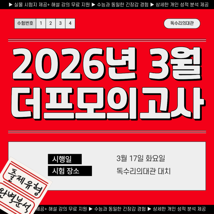 수능을 향한 흐름을 점검해야 하는 시점, 실제 수능과 가장 유사한 환경에서 자신의 위치를 확인할 기회가 필요하다면 3월 더프 모의고사 현장 응시가 가장 확실한 선택입니다. 독수리의대관 대치에서는 2026년 3월 17일(화) 실시되는 3월 더프 모의고사 재원생/외부생 현장 응시 신청을 받습니다. * 선착순 접수로 진행되며, 마감 시 조기 종료됩니다. 더프 모의고사란? 더프리미엄 모의고사는 대성 마이맥에서 개발한 수능 실전 대비 프리미엄 모의고사로, 수험생들 사이에서 "가장 수능과 닮은 모의고사"로 평가받고 있습니다. 더프 모의고사가 중요한 이유 실제 수능과 유사한 출제 경향 난이도 과목별 정밀 성적 분석 + 온라인 성....... <img src="https://blogthumb.pstatic.net/MjAyNjAyMjJfMjMw/MDAxNzcxNzcwMTA2OTI3.wZKqNwyjZeYReqZbgBfot1k_kIpTH0vsCSALnf-4Sg4g.RCCOI4-7TpHLkx6q4kEkaZvG6E4BY_7okG-ahrdlLKMg.PNG/%C0%C7%B4%EB%BC%B1%B9%E8_%B4%F5%C7%C1%B8%F0%C0%C7%B0%ED%BB%E7_%282%29.png?type=s3" />