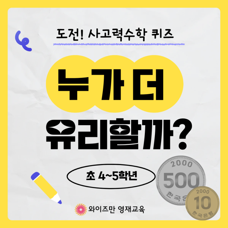 즐거움, 깨달음, 감동이있는 교육 와이즈만 영재교육입니다. 오늘은 아주 흥미로운 사고력 수학 문제를 소개해 드리려고 하는데요. 바로 50개의 동전 가져가기 게임입니다. “큰 동전을 빨리 집는 사람이 유리하지 않을까?” 생각하게 되지만, 이 게임 속에는 운이 아닌 전략, 그리고 수학적 구조가 숨어 있습니다. 우리 친구들은 이 게임 안에 숨은 전략을 알아챌 수 있을까요? 와이즈만과 함께하는 사고력수학 문제, 지금 시작합니다! [문제] 동전 가져가기 게임 상혁이와 용복이 중 누가 더 유리할까요? 10원, 50원, 100원, 500원의 동전 총 50개가 일렬로 무작위로 놓여있습니다. 상혁이와 용복이는 다음과 같은 규칙으로 게임을 합니다. 1. ....... <img src="https://blogthumb.pstatic.net/MjAyNTEyMjRfMTM1/MDAxNzY2NTQ0Mjc2MzMw.J0S1C5fbvrIdiXczwYGXmTgCG6xLzu8H816LAfBijKcg.5JM1X6Ygj4hLXVC_Ebt1K81EJjgk1f-i376q4Z1AH7Eg.PNG/%C1%A6%B8%F1%C0%BB_%C0%D4%B7%C2%C7%D8%C1%D6%BC%BC%BF%E4._%2823%29.png?type=s3" />