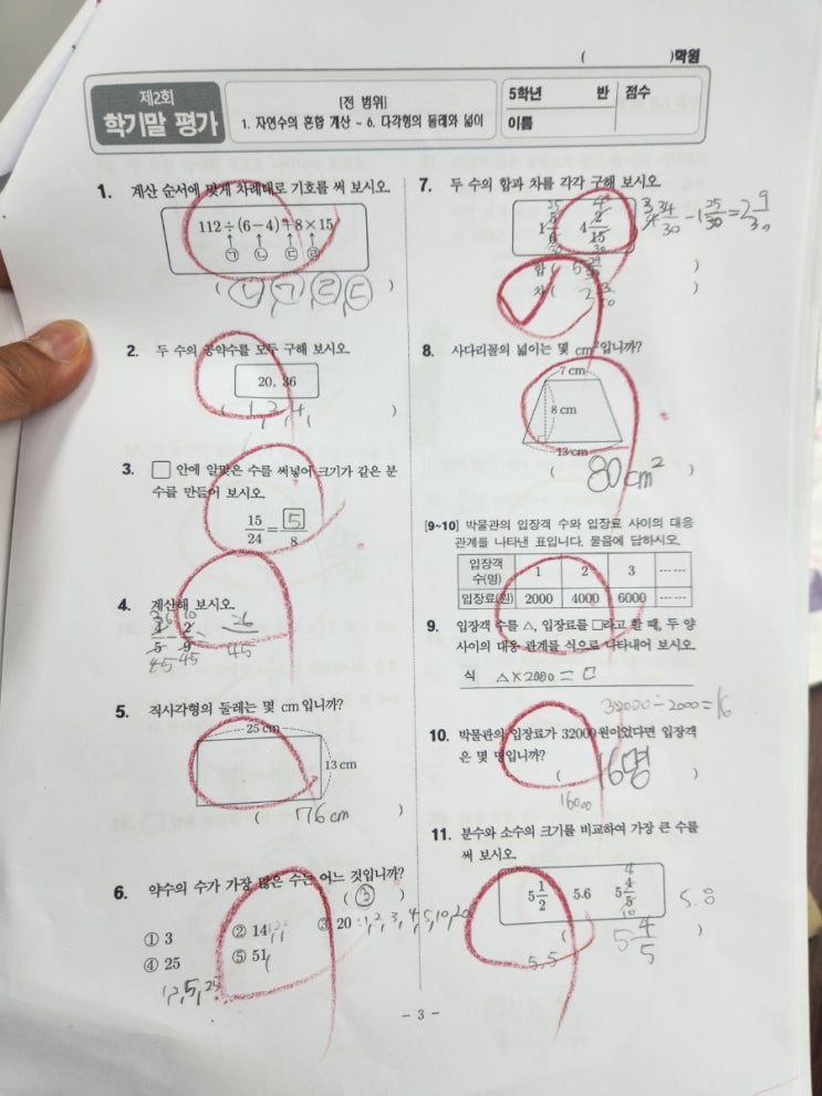 10월부터 다닌 초4 축구하는 친구 집에서 5-1 기본유형 풀다 왔고 원에서 남아있던 최상위도전유형 마무리. 5-1 응용하며 5-2 개념서 했고 현재 5-2응용 90%쯤 끝낸상태 어머니께서 숙제 많이 달라셔서 많이 내어줬더니 진도가 확확 나간 ^^ 아직 응용문제, 긴문장제는 좀 어려워하기도 하지만 현행에 단평대비 충실히하고 넘어갈꺼니까 걱정없음 무엇보다 글씨체가 이쁘고 식쓰라고 하면 식을 쓰는게 큰 장점^^ 아무리 쓰라고 해도 안쓰는 친구들도 있습니다^^; 5-2 총정리 집에서 대충 풀어서 틀렸지만 대부분 스스로 고친^^; 한번에 맞히면 좋을텐데 그 부분이 아쉽습니다만 아이가 스스로 느껴야 변화가 있는 부분입니다. 단평마무리는 최상....... <img src="https://blogthumb.pstatic.net/MjAyNTEyMjVfMjAz/MDAxNzY2NjYxMTM0OTM2.uz2Cqk2Y33jNVciEzVWq4isHQq3iYiudp8VHzO28Mzgg.rMreEjIEB4ZC57-xsaiD6xuyZwCCT_Peha2MzngTK4cg.JPEG/900%A3%DF20251224%A3%DF183601.jpg?type=s3" />