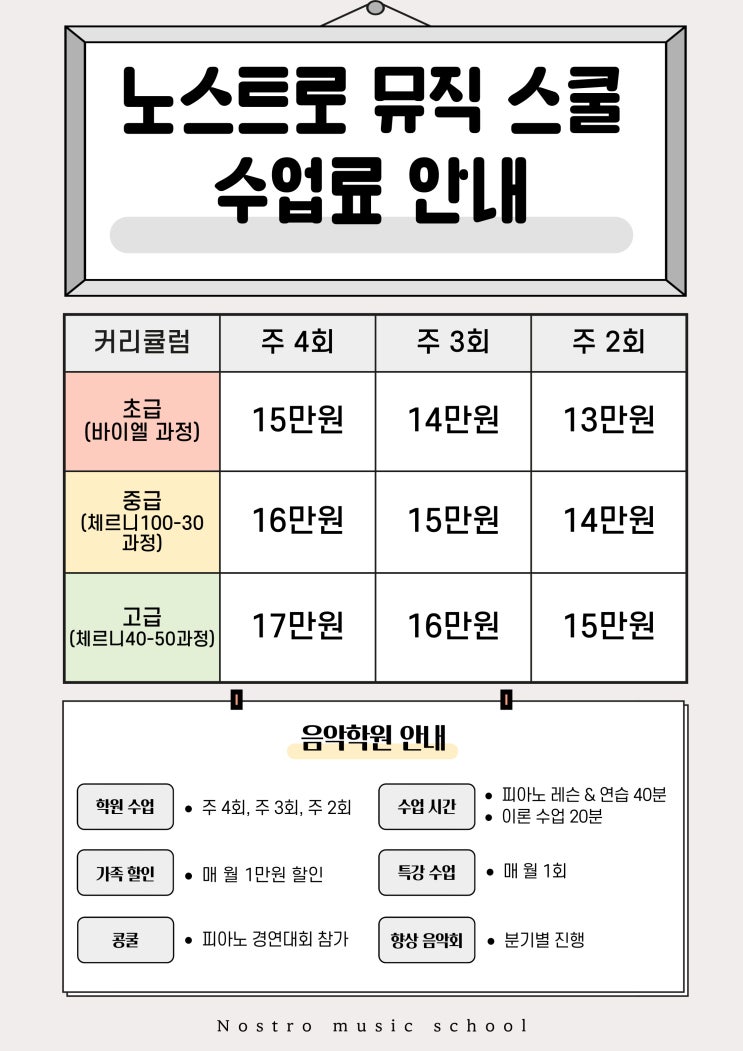안녕하세요 노스트로 뮤직 스쿨 음악학원입니다:) 저희 음악학원 수업료 안내 드립니다^^ 저희는 주 4회 운영으로 월, 화 ,목, 금 4일 운영하고 있습니다. (수요일은 운영을 안하고 있습니다) 수업은 주 2회부터 4회까지 선택하실 수 있으시며 초급, 중급, 고급 과정별로 수업료가 안내됩니다. 타임별로 인원을 제한하여 1인 1연습실을 제공하고, 타임은 30분 단위로 선착순으로 받고 있으며 인원이 차면 마감이 됩니다. 그리고 저희는 매년 정기 연주회을 하고 있으며 수시로 피아노 콩쿨 대회에도 참여하고 있습니다. 추가로 더 궁금하신 점은 010-9594-6573으로 연락주세요. 감사합니다:) <img src="https://blogthumb.pstatic.net/MjAyNTEyMjdfMTMx/MDAxNzY2ODIxNjk1ODQ2.9ClH6MY9qSoe-4ivEemQe2lrKZd1Ermp3W0J3A0Jy00g.cHs7m8PE2wH-ZgrKaOA3FryZH54Omca6t-nUhKRFnUsg.JPEG/%C1%A6%B8%F1%C0%BB_%C0%D4%B7%C2%C7%D8%C1%D6%BC%BC%BF%E4._%281%29.jpg?type=s3" />