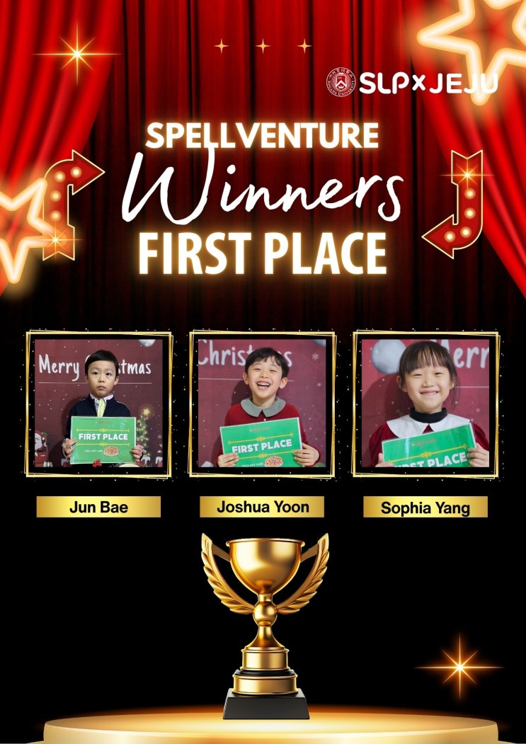 안녕하세요? JEJU SLP 입니다! 2025년을 마무리하는 크리스마스 연휴 모두 모두 행복하고 편안한 시간이셨기를 바랍니다! 초등 저학년부에 이어 오늘은 유치부 Spellventure Word Contest 수상자들을 소개해 드리려고 합니다! 이번 대회는 아이들이 즐겁게 어휘 실력을 늘려갈 수 있기를 바라는 마음으로 준비했습니다! 책상 위에서 긴장하기보다, 마치 집처럼 편안한 분위기 속에서 자연스럽게 참여할 수 있도록 강당에서 자유로운 방식으로 진행했답니다. 많은 친구들이 열심히 준비해 준 덕분에 웃음과 응원이 가득한 따뜻한 시간이었습니다. 아이들이 자신만의 속도로 단어를 떠올리고, 고사리 손으로 또박또박 적어가며 끝까지 참여해 주는....... <img src="https://blogthumb.pstatic.net/MjAyNTEyMjdfMjQw/MDAxNzY2ODEyMDQxMDIx.n871Wp9wSpLvD8wwXW-FtkrrI1z70ycRILCXV1LO7j0g.wKiZpMXNFi2WiKGvFlri1cVday9AlLlcqiZo0YnsHAQg.JPEG/4.jpg?type=s3" />