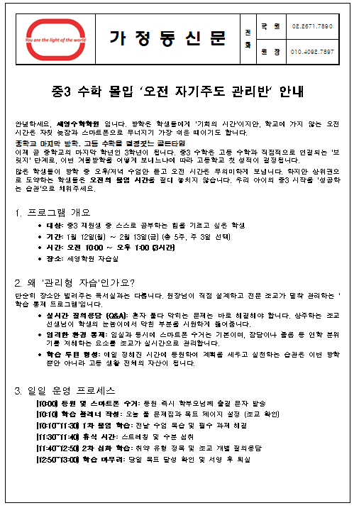 [겨울방학특강] 자기주도 학습반 개설 (예비중3 대상 * 외부학생 신청가능)