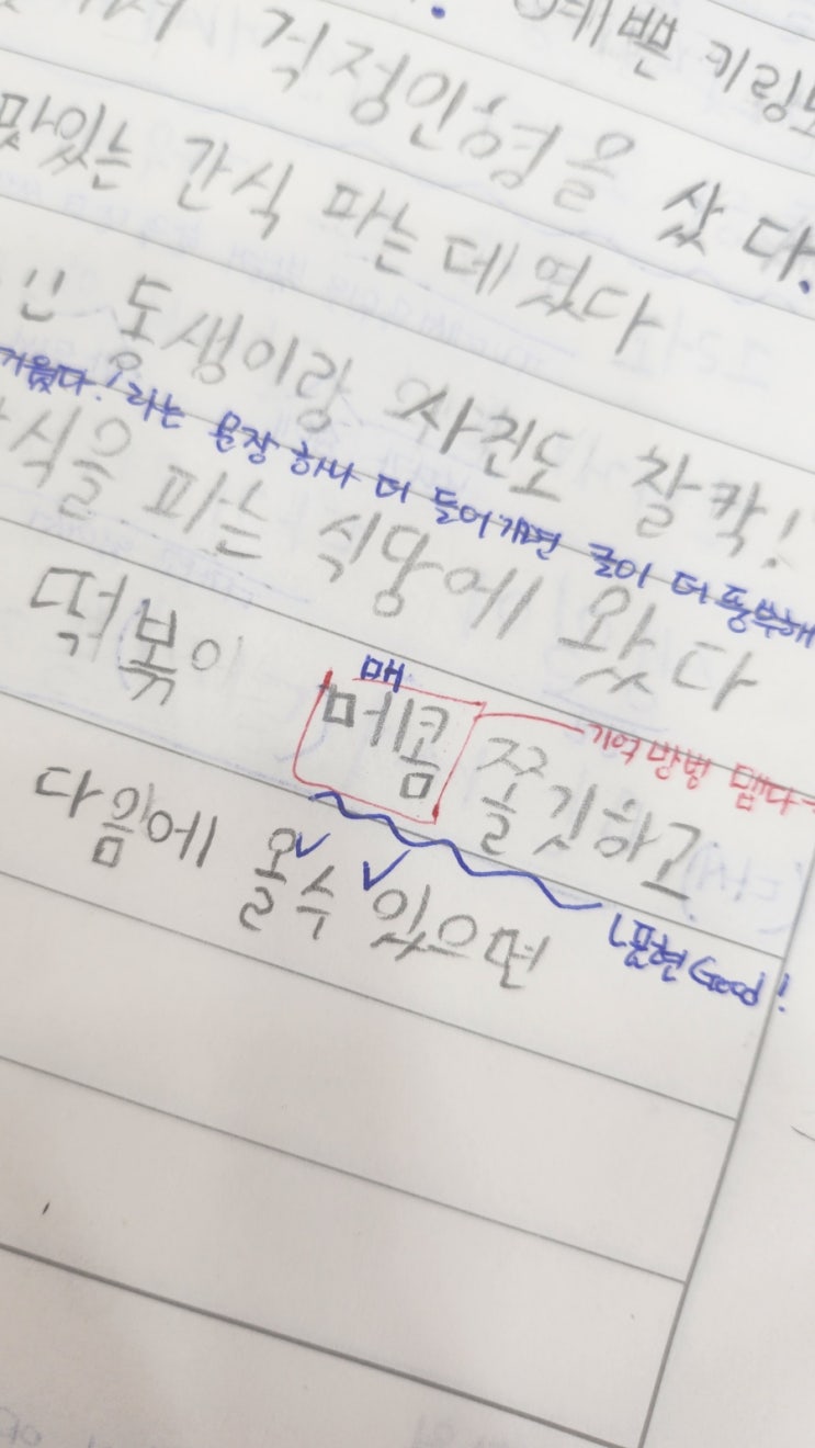 초등 1학년 아이들의 일기를 읽다 보면 깜짝 놀랄 때가 많습니다 “탱글탱글 맛있었다.” → 단순한 ‘맛있다’가 아니라 식감을 살린 표현입니다. “고기가 입안에서 사르르 녹았다.” → 감각이 살아 있는 문장입니다. 먹는 장면이 자연스럽게 그려집니다. 이런 문장들은 그냥 지나치지 않습니다. 반드시 표시해 주고, 충분히 칭찬해 줍니다. 좋은 표현을 알아봐 주는 경험은 아이의 글을 더 자라게 합니다. 하지만 칭찬만 하지 않습니다. ✔“메콤” → “매콤” 들리는 대로 쓰는 습관은 저학년 때 정확히 잡아야 합니다. ✔ “같다” / “갔다” 구별 → 받침 하나 차이지만 의미는 완전히 달라집니다. 단순 암기가 아니라, 문장 속에서 이....... <img src="https://blogthumb.pstatic.net/MjAyNjAyMjJfMTY4/MDAxNzcxNzcyMjU5Mjk5.DZngjTWuD-xXOP-IudEBqtl3zTgfJqYJkkLoBFAtYiog.VFMusjwvm3n6RrppBJtjpN58g_z4E2l-Lk2gVgAktyAg.JPEG/900%A3%DF20260220%A3%DF115918.jpg?type=s3" />