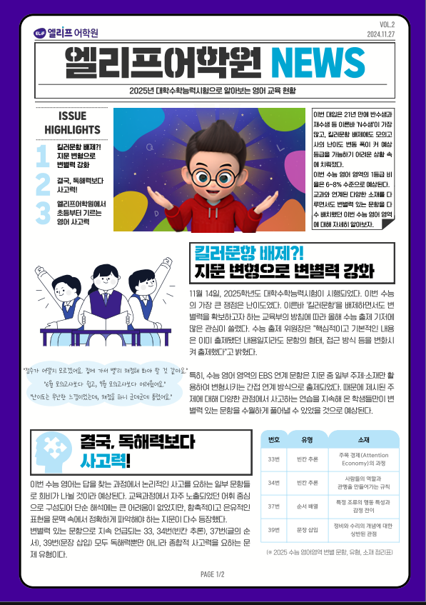 유치부에서 중등부까지 믿고 맡길수 있는 엘리프어학원~! 우리친구들은 중2까지 하면 고등부는 스스로 할 수 있게 된다네요.^^ 앞서가는 영어 엘리프에서 수능독해수업의 핵심을 배워보아요~! <img src="https://blogthumb.pstatic.net/MjAyNTEyMjRfMTAy/MDAxNzY2NTUzMDQ0NzIx.Zwf5GdTyi5UlB5sWBKNzArSFoMM5ivpC7A49ZxycScEg.WWF2PuUHEqeyOgF0BMHxTbUHQcpvyU92QCCfxlEJqyIg.PNG/NEWS_4%C8%A3.png?type=s3" />