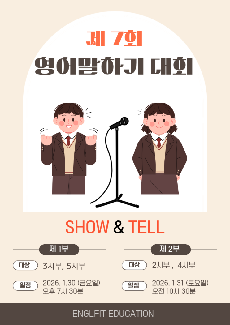 아이들이 가장 빛나는 순간, 잉글핏 영어말하기 대회 안녕하세요! 누구나 즐거운 영어 모국어처럼 하는 영어 미래 글로벌 리더의 시작! ENGLFIT EDUCATION 입니다. 잉글핏어학원에서는 1년에 두 번 영어말하기 대회가 열립니다. 이 시간은 단순히 영어 실력을 보여주는 자리가 아니라, 아이들이 스스로의 가능성을 발견하고 한 단계 더 성장하는 특별한 무대입니다. 처음 발표를 준비할 때 아이들의 표정에는 조금의 걱정이 묻어 있습니다. “제가 영어로 발표할 수 있을까요?” “무대에 올라가면 떨릴 것 같아요.” 하지만 원고를 읽고 또 읽고, 발음과 리듬감을 연습하고, 친구들 앞에서 작은 발표를 해보는 과정을 거치면서 아이들의 목소리....... <img src="https://blogthumb.pstatic.net/MjAyNjAzMDhfMjE2/MDAxNzcyOTgwMTAxNTMx.xsOhxLl-HO7v434EfJ2W9kOSr_m_-w03Wrn_8hpLPtAg.BTWB6R8DkTfglYKAJiuuJhuOBLpjuB74jWBqh_KQ9EUg.PNG/%BC%EE%BE%D8%C5%DA.png?type=s3" />