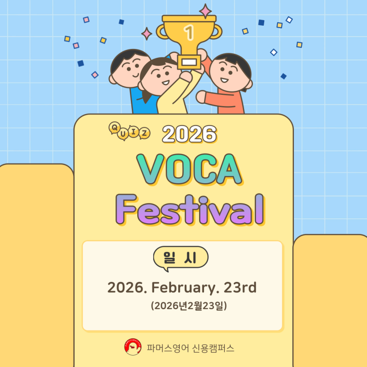 안녕하세요^^ S.Y.P 원장 Amily입니다. 2026년 파머스 신용 캠퍼스의 첫 도전 Voca Festival이 있었습니다. 거의 두 달간 배운 단어들을 복습할 수 있는 시간이었습니다. 중간 독감에 걸린 친구들도 많았었지만 많은 친구들이 도전을 하고 성취를 하였습니다. 아쉬운 친구들 성취한 친구들 모두에겐 도전이었고 경험이었습니다. 이런 경험들 하나하나가 우리 친구들을 성장시켜 줄 거라 믿습니다. 우리 친구들의 도전을 영상으로 만들어 보았습니다. 그리고 나른해지기 쉬운 다음 4월 또 하나의 도전을 준비했습니다. 우리 친구들이 매일 녹음을 하며 읽기 연습을 하고 있는데요. 그 결과물이 될 수 있는 "Let's read aloud" 친구....... <img src="https://blogthumb.pstatic.net/MjAyNjAzMDhfODMg/MDAxNzcyOTQ0NjM3MDg1.C9YxjKjlyBzM3B5YR-WauIkzsyEDK_I0FsPWHQwbuAUg.7BEVdje42ugLv_md6trlpi1YveDZfyPu0pJOHESJmtwg.PNG/%BA%B8%C4%AB%C6%E4%BD%BA%C6%BC%B9%FA2026.png?type=s3" />