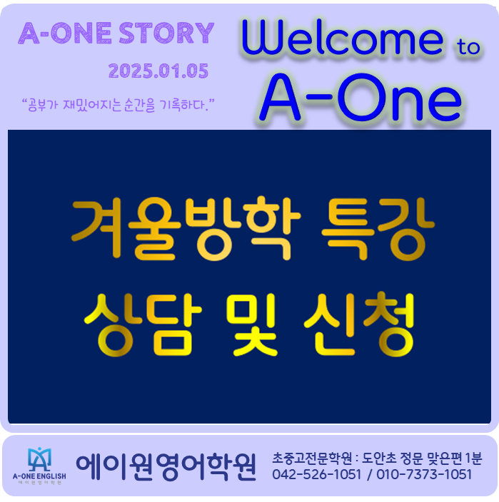 겨울방학 특강 상담 및 신청 ▶ 아래 링크 클릭 자세한 사항 아래 참조 이런 학생에게 추천합니다 ✔ 영어를 처음 접하는 초등 저학년 경우 ✔ 방학마다 공부했지만 학년이 바뀌면 다시 힘들어지는 경우 ✔ 파닉스·문법·어휘 중 기초가 불안하다고 느껴지는 경우 ✔ 새 학년을 앞두고 영어의 방향을 정리하고 싶은 경우 ✔ 단기 성적보다 지속 가능한 실력을 원하는 경우 안내 사항 ※ 소수정원 / 반별 정원 6명(3회반) · 8명(매일반) ※ 선착순 마감 (최소 인원 3명) ※ 레벨 상담 후 반 배정 따뜻한 겨울방학, 아이의 영어가 새 학년까지 자연스럽게 이어질 수 있도록 에이원이 함께하겠습니다. 소수정예 ㅣ 밀착관리 ㅣ 책임지도 에이원....... <img src="https://blogthumb.pstatic.net/MjAyNjAxMDVfMTA2/MDAxNzY3NTc0ODgzNDc3.TzYHoOFxlNcB3iwAVZRwhOBiiJF9U74y8U-bXxVmKo4g.zTN4yVIygOdf2Nnp9WitXzoXz5pIziINtSlR-yDsWj0g.PNG/image.png?type=s3" />