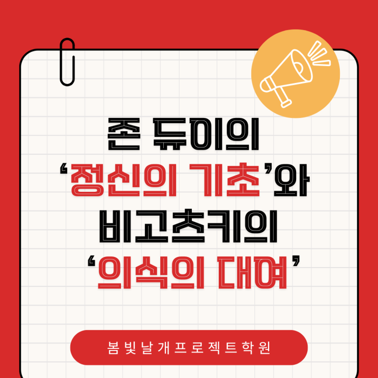 레지오 교육자들과 부모님들은 어려운 결정을 내려야 할 때나 장애를 극복해야 하는 순간에 다음과 같은 개념을 항상 염두에 두고 있었다고 합니다. 바로 존 듀이의 ‘정신의 기초’와 비고츠키의 ‘의식의 대여’입니다. 어린이의 배움은 어디에서 시작될까요? 우리가 흔히 생각하듯 머릿속에서 갑자기 만들어지는 것이 아니라, 어린이가 몸으로 탐색하고 관계 안에서 이해하며 조금씩 자라나는 과정입니다. 이 과정은 존 듀이(John Dewey) 와 비고츠키(Vygotsky) 가 말한 핵심 개념과 깊게 연결됩니다. 존 듀이가 말한 ‘정신의 기초’ 듀이는 어린이의 정신이 고정된 구조가 아니라, 경험의 흐름 속에서 만들어지는 살아있는 과정이라고....... <img src="https://blogthumb.pstatic.net/MjAyNTExMjZfOTUg/MDAxNzY0MTI3NjA0MDc3.u9udRBQye44pf1aX9Z9VTa9zYNO2Xzc1qjdk3ikamWog.K0k8Q1gWFL4-HsiPk1NiaWT-PbzCS8AvMPklDIgifbQg.PNG/%C1%B8_%B5%E0%C0%CC%C0%C7_%26lsquo%3B%C1%A4%BD%C5%C0%C7_%B1%E2%C3%CA%26rsquo%3B%BF%CD_%BA%F1%B0%ED%C3%F7%C5%B0%C0%C7_%26lsquo%3B%C0%C7%BD%C4%C0%C7_%B4%EB%BF%A9%26rsquo%3B.png?type=s3" />