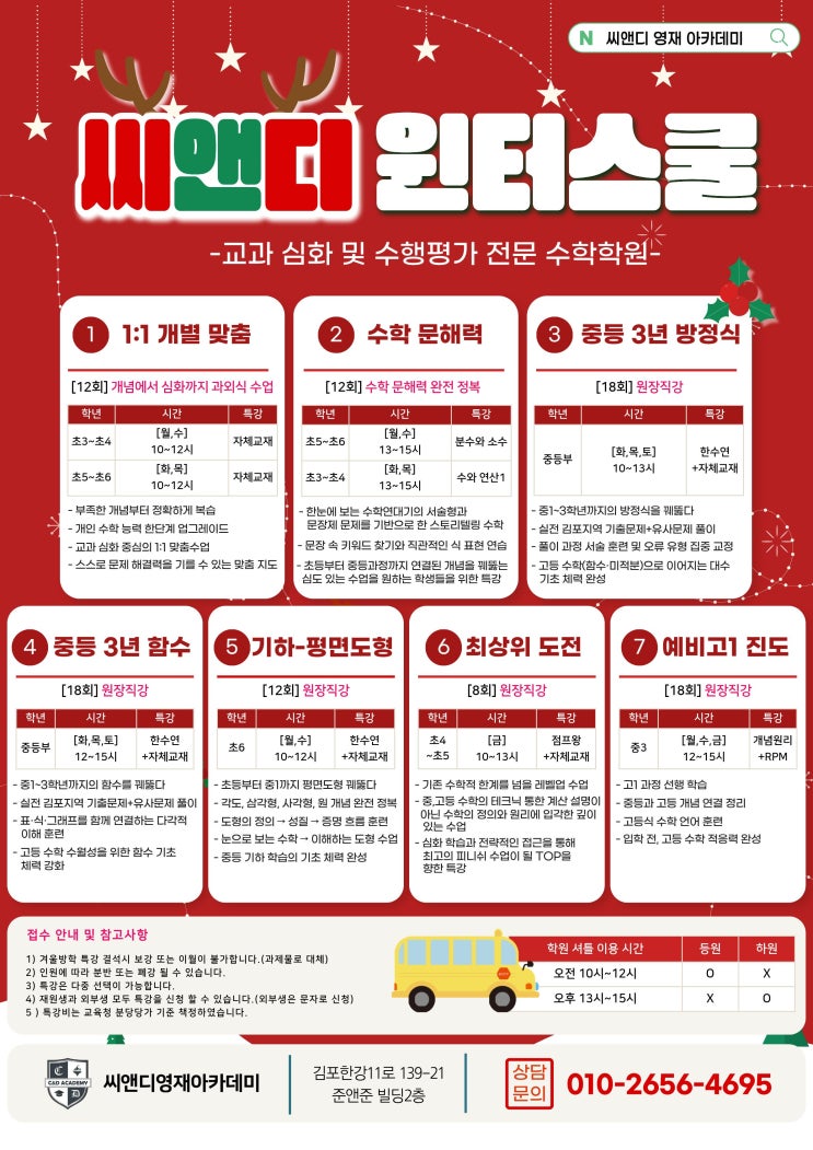 안녕하세요 교과 심화 및 수행평가 대비 전문 학원 씨앤디 영재 아카데미 입니다. 저희 씨앤디 영재 아카데미는 한눈에 보는 수학연대기 김포 직영관으로 김포 운양동에 위치하고 있습니다. 각 학년의 중요한 터닝포인트가 될 26년 겨울방학은 단순히 “쉬는 시간”이 아니라 한 학년을 정리하고 다음 학년을 준비하는 가장 중요한 시기입니다. 씨앤디 영재 아카데미는 단기 성적 향상이 아닌 개념이 잡히고 생각하는 힘이 커지는 수학 수업 을 목표로 씨앤디만의 윈터스쿨을 준비했습니다. ※특강 신청 방법※ 강좌번호와 함께 문자 주시면 친절히 상담해드리도록 하겠습니다. (원장직통) 010-2656-4695 (예시) 운양초5 이수학 1,3번 특강....... <img src="https://blogthumb.pstatic.net/MjAyNTEyMDNfMjE5/MDAxNzY0NzYyOTYyNDkx.zCmiM0d_743iwJAo4YA7TpfT1lXKTx1MaUGLroTJoMgg.mA9n4mFTWYL80RJpEXN7eEJTrsZTpLK_yYF2KrVIfzog.JPEG/25%B3%E2_%C6%AF%B0%AD_%281%29.jpg?type=s3" />