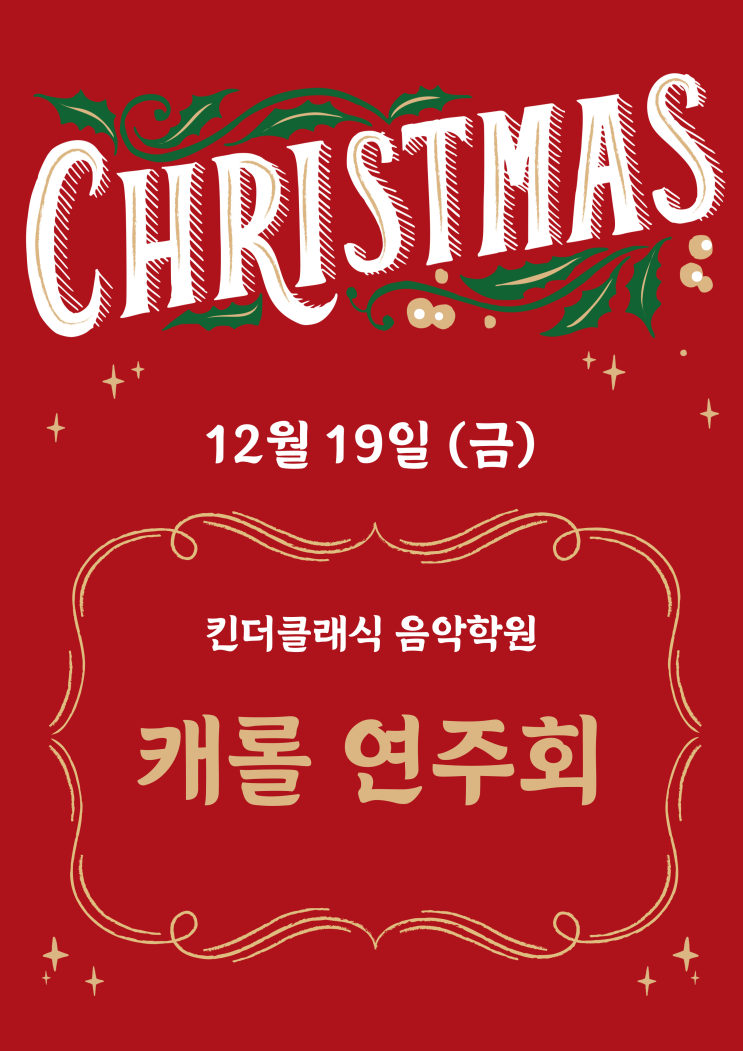안녕하세요 김포 마산동 킨더클래식음악학원입니다. 킨더클래식에서는 두 달에 한 번, 우리 킨더 친구들을 위해 무대 수업을 진행하고 있어요 이번 달 무대 수업은 크리스마스와 연말 분위기가 가득한 캐롤 연주로 준비했어요✨ 아이들이 한 곡 한 곡 열심히 준비한 만큼 더 따뜻하고 특별한 시간이 될 것 같아요 무대 앞에서 연주한다는 건 단순히 곡을 완성하는 것뿐 아니라 용기, 집중력, 표현력까지 함께 자라는 경험이에요 이번 캐롤 연주회도 따뜻한 응원 부탁드립니다 #마산동은여울초피아노 #무대수업 #피아노연주회 #캐롤연주회 #원내연주 #향상연주 #김포피아노 #음악교육 #피아노발표수업 #피아노배우기 #마산동....... <img src="https://blogthumb.pstatic.net/MjAyNTEyMDhfMTUw/MDAxNzY1MTY5NTEwNjM3.TVvI3xHgv3S4Gx1k_dqiPaXsApfVuvxAkJNL-C7sTC4g.DqWu4jsUkMfiIktB5b5NfI5SSj38vty1YJzNdMi4plgg.PNG/image.png?type=s3" />