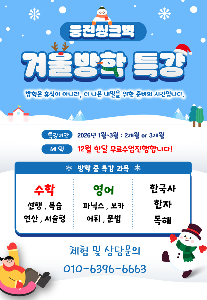 안녕하세요 웅진 일산지국장입니다~ 이제 겨울방학이 얼마 안남았습니다~! 웅진 씽크빅에선 겨울방학특강을 다양하게 준비하고 있습니다~! 웅진에서 준비한 특강을 소개해 드릴게요~ 한국사 특강 전략적 독해 특강 연산 특강 겨울방학 특강 초등학교 입학을 앞둔 어머님들은 특히나... 이번 겨울이 정말 중요합니다!!! 초등학교 입학 준비도 웅진씽크빅으로 준비해주세요^^ 웅진씽크빅은 방문학습 학습센터 공부방 다양한 학습형태가 있습니다! 우리 아이에게 맞는 학습을 선택해주세요^^ <img src="https://blogthumb.pstatic.net/MjAyNTEyMDhfMTY2/MDAxNzY1MTc0NTEwNTIy.8TKgqb2qmu1BUUbh9WOku7q5WQg_J-ZKZwJVpwizPQ8g.WrDr9CGKThZfLE6sH3mAL3nu7PjX9vLIyzdCfT3hZHAg.PNG/image.png?type=s3" />