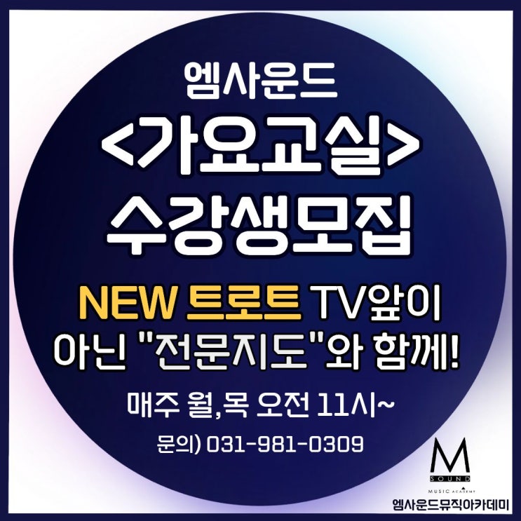 안녕하세요_엠사운드입니다! ♀️ 봄을 맞이하여 보컬에 대한 문의가 많은데요! 새록새록, 꿈도 생각나고 콧노래 흥얼거리기 좋은 계절 또 최근 보컬 오디션 프로그램이 성행을 하며 관심도가 많이많이 높아진듯 합니다! 꼭 어르신들이 아니더라도 대한민국 성인이면 모두가 신청 가능하고, 자주보시던 TV프로그램에서 따라부르던 곡들을 위주로 커리큘럼이 형성되었다니 너무 구미가 당기는 수업 아닐까요? 나에게 맞추어서 1:1 수업도 좋지만, 친구들과 동료들과 함께 발맞추어 수업하는 그룹레슨을 원하시는 분들이 많아 고민끝에 수강생들의 니즈에 맞춰 그룹레슨을 개강하게 되었습니다! 매주 월, 목 낮 11시부터 수업을 진행하....... <img src="https://blogthumb.pstatic.net/MjAyNjAzMjRfMjU0/MDAxNzc0MzM2MjgyNjUy.0KVfPISBh_g3KF7c9PZbkLfIvMkhcKxyluMJdiibQz4g.faOgHUQ9bHUS8nWKtWhmMFJTpt9PiIQzGdt1NGczucAg.JPEG/%B0%A1%BF%E4%B1%B3%BD%C7%B3%BB%BC%F6%BF%EB.jpg?type=s3" />