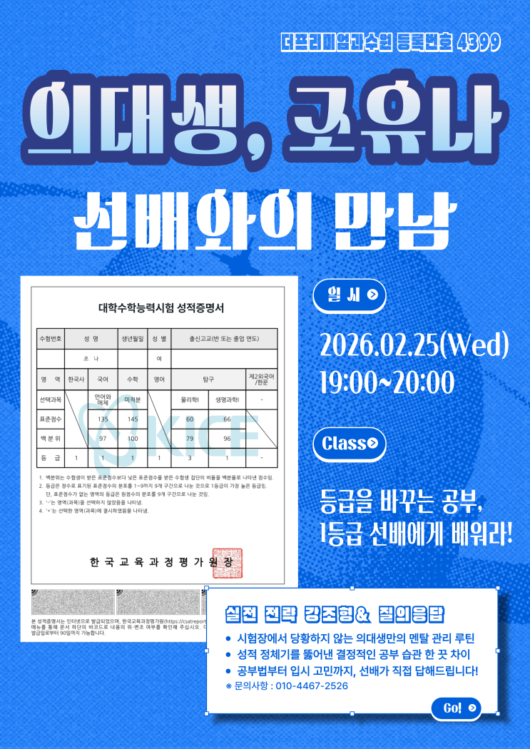 더프리미엄과수원 등록번호 4399 안녕하세요! 더프리미엄과수원학원입니다. 오늘은 우리 학생들에게 아주 특별하고 동기부여가 팍팍! 되는 소중한 시간이 있었는데요. 바로 본 학원 출신의 의대생 선배와 함께하는 멘토링 시간이었습니다! ✨ 공부법부터 마인드 컨트롤까지, 꿀팁 대방출! 단순히 "공부 열심히 해라"는 뻔한 이야기가 아니었습니다. 선배님이 직접 겪었던 시행착오와 수험생활의 생생한 후기를 아낌없이 나누어 주었는데요. 과목별 핵심 공략법: 상위 0.1%를 결정짓는 과탐 학습 전략 슬럼프 극복기: 성적이 정체될 때 멘탈 관리하는 법 플래너 활용법: 효율적인 시간 관리와 오답 노트 정리 노....... <img src="https://blogthumb.pstatic.net/MjAyNjAyMjVfMTAw/MDAxNzcxOTk5Njg1MDg3.llDvH9ZNOC28dPTusNuoG8_RnG0Z0YSQk7meYUhnwbYg.3UD8HirWD1cz3bBr_g73udwp0spu-SSOCw3_TnP9GlMg.PNG/%C0%C7%B4%EB%BB%FD%2C_%BC%B1%B9%E8%BF%CD%C0%C7_%B8%B8%B3%B2_%281%29.png?type=s3" />