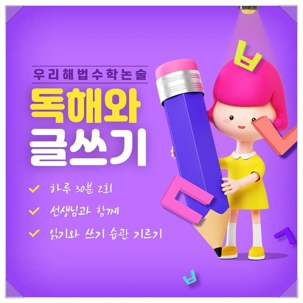 늘 아이들을 위해 좋은 수업을 만드는 우리해법수학논술학원입니다. 요즘 초등학생들에게 꼭 필요한 능력이 바로 '문해력'입니다. 문해력이란, 글을 읽고 이해하는 것을 넘어 그 글을 활용하고 자기 방식으로 표현하는 종합적인 능력을 말합니다. 참 어렵지요? 문해력 향상을 위해 저희도 열심히 논술 수업을 진행하고 있지만 많은 학생들에게는 진입 장벽이 높은 수업이기도 합니다. 이 문제를 해결하기 위해 긴 수업시간과 반 구성에서 자유로운 새로운 논술 수업을 준비했습니다. 수업 특장점 1️⃣ 주 2회 30분 or 주 1회 60분 수업 선택 가능합니다. 2️⃣ 읽기와 쓰기를 병행하여 균형 있게 교육합니다. 3️⃣ 수업 시간을 자유....... <img src="https://blogthumb.pstatic.net/MjAyNjAyMjRfMjcw/MDAxNzcxODY1MTIwNDY4.LrGhgAfqOajWaaz_R9mdFQFYCIBtaw_Zi_5XmUyjhcUg.blKJ-Gk_B1KMshXDv0NHNX23LDKjNGnv06wKy7WnhEMg.JPEG/%B4%EB%B9%AE.jpg?type=s3" />