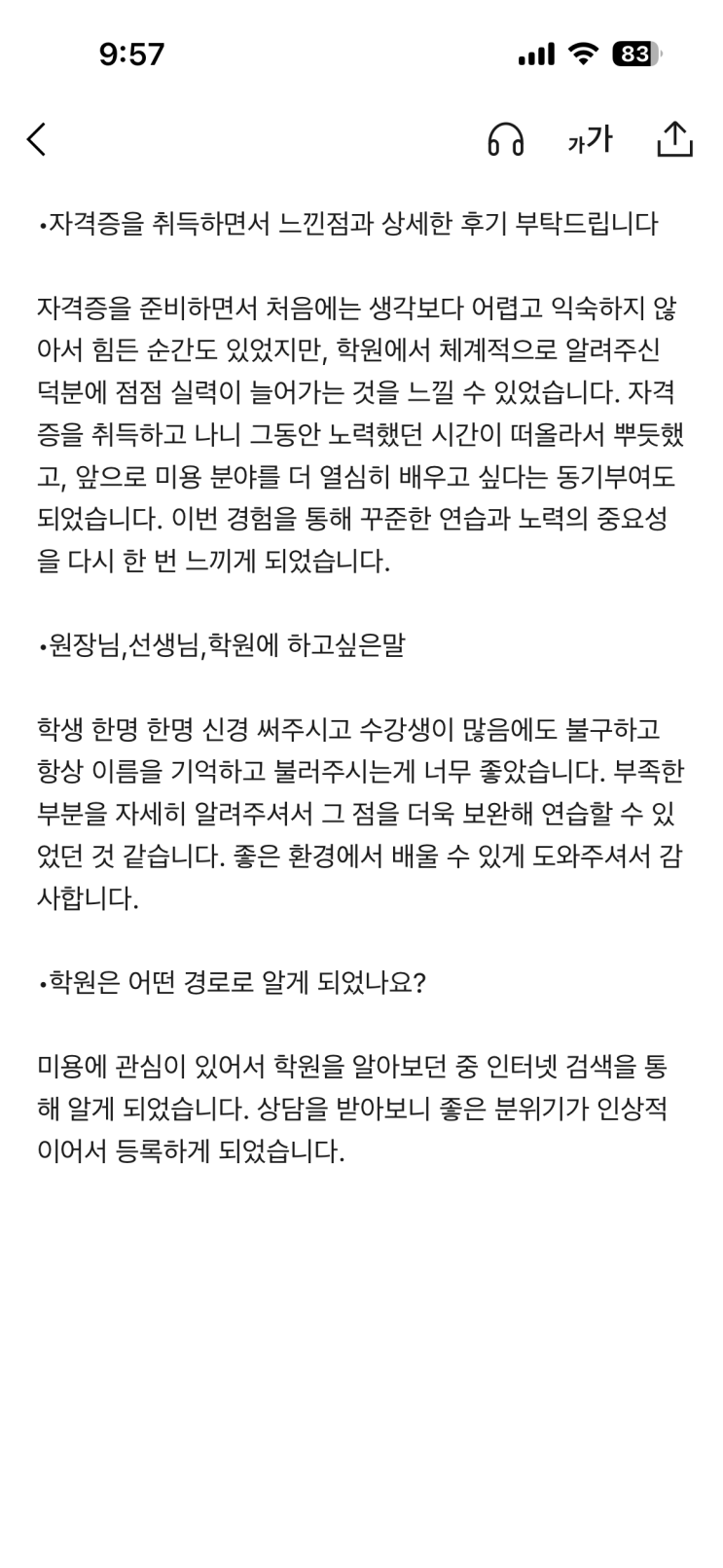 정 지 아 님 합격을 진심으로 축하드립니다^^ 소중한 수강후기 정말 감사합니다^^ -시크릿뷰티미용학원- <img src="https://blogthumb.pstatic.net/MjAyNjAzMTFfMzkg/MDAxNzczMjExMTIxMTMw.Ps00bCdg8j7gtPdpgXXuegyDav5PS-xDG_HFhivVsdIg.1cdrX2RVNN-VZv00xJwjusZI8CLHT3PmdAimk8N39o4g.PNG/KakaoTalk_20260311_100032920.png?type=s3" />