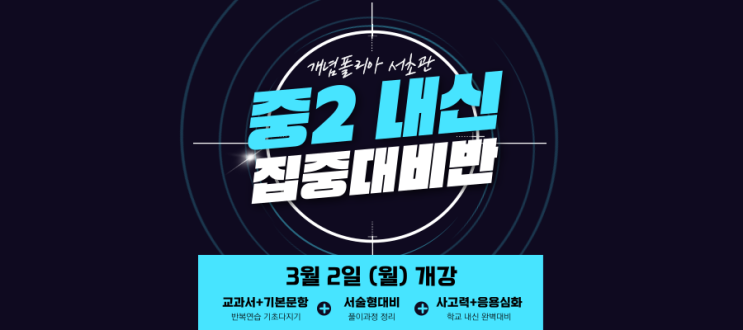 안녕하세요 개념폴리아 서초중등관입니다. 본격적으로 내신 성적을 위한 철저한 준비가 필요한 중학교 2학년 학생들, 지금부터의 준비가 성적을 좌우합니다. 1. 교과서 기본문항의 반복 연습 → 정확하고 빠른 문제 풀이 2. 학기 중 수행평가와 서술형 평가 대비 → 풀이노트를 통한 풀이 과정 정리 3. 점점 난이도가 높아지는 서초지역의 학교 시험을 위한 사고력 + 응용심화 문제 대비 기본기를 다지고, 불안을 줄이고, 성적으로 증명하는 ‘중2 내신 집중 대비반’을 모집합니다. 개강일 : 3/2(월) 수업일 : 월수금 5시~10시 ▶ 개강 및 수업일 개강일 : 3월 2일 월요일 요일 및 시간 : 월수금 Pm 5:00~10:00 [2026년 중2 내신 집중 대비반 예....... <img src="https://blogthumb.pstatic.net/MjAyNjAyMjRfMjc4/MDAxNzcxOTI3NjQ2NDM0.dx5f5rACURQZkT-1B1j98ajNUd06fF3Yuwosyqi-ywsg.uX9ghod-KsnlhJMOVadBFqX6AFaZjewNfKE73RBfWD0g.PNG/%B0%B3%B3%E4%C6%FA%B8%AE%BE%C6-25%B3%E2-%BC%B3%B8%ED%C8%B8-%BD%E6%B3%D7%C0%CF-015_%281%29.png?type=s3" />