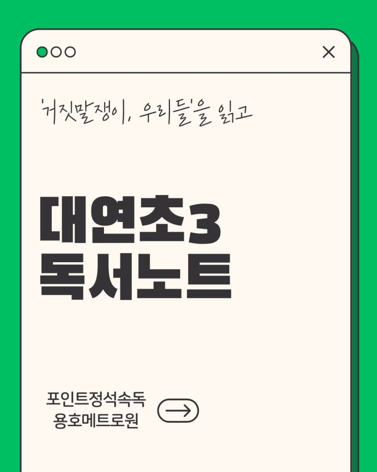 대연초3 독서노트 피드백 또래 친구들의 이야기를 담은 《거짓말쟁이, 우리들》, 재미있게 읽었나요? 아빠가 돌아가신 후 소미는 베프 채연이와의 관계가 예전 같지 않아요. 거창하게 생일 파티를 한 채연이가 부러웠던 소미는 자신도 똑같이 생일 파티를 하고 싶었고, 이를 위해 시작한 거짓말은 또 다른 거짓말을 낳았어요. 소미는 이제 거짓으로 덧대고 덧댄 누더기 성을 버리고 그 빈터에 오두막을 짓기로 결심해요. 성보다 크고 멋지지 않더라도 그 오두막이야말로 진짜 소미를 만나는 공간이에요. 거짓말로 만들어진 가짜 공간은 곧 허물어질 모래성이지만, 진짜 나로 쌓은 공간은 절대 무너지지 않을 거예요. 다음 시간에 우리 다시 만나....... <img src="https://blogthumb.pstatic.net/MjAyNjAzMTNfOTIg/MDAxNzczMzkwMDEzMzY5.REfZVLN51WGuY5bIJ4kMSmu5tW9Pb6PSTdrKvcFU1hIg._BSfNGSh82I3Z7bptjp7-OyGJrSfl7tA1sfdTU-GaA8g.JPEG/%3F%8F%85%3F%84%9C%3F%85%B8%3F%8A%B8.jpg?type=s3" />