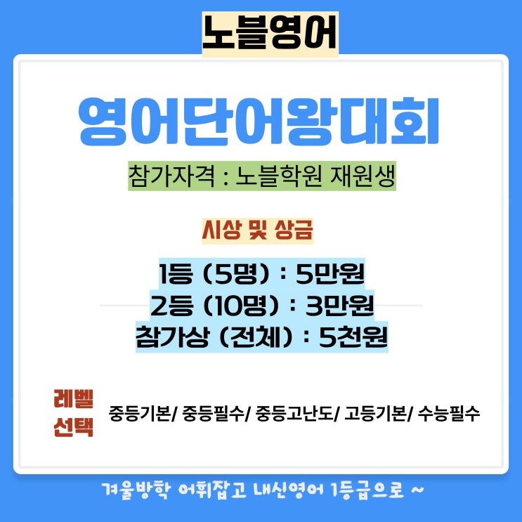 노블영어 겨울방학 단어왕대회 총상금 100만원 참가방법 및 시상 1. 학원어플에서 선택된 레벨에 들어가 시작 2. 본인이 시작한 날짜 부터 일자 시작됨 3. 레벨 끝나는 날짜 까지의 일자가 본인 기간임 4. 기간동안에 A+ 점수가 포인트 참여를 원하는 학생들은 담임선생님을 통해 시작하세요! 대회기간 12월22일(월)~2월27일(금) 위 기간중 본인이 시작날 부터 날짜 계산됩니다 단 위 기간이 지나면 시상에서 제외 됩니다 <img src="https://blogthumb.pstatic.net/MjAyNTEyMTdfMjgx/MDAxNzY1OTYxMDk4OTA2.LLh6W9x9O85dD52wODvib8YqL24-SbxIaTrQNu-va0wg.F5SmeuxvKjW5NAuUMbnZWALxXt2YC0ihMhHncaVdzoAg.JPEG/%B4%DC%BE%EE%BF%D5%B4%EB%C8%B8_%282%29.jpg?type=s3" />