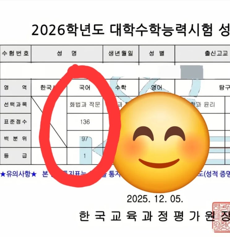 2026학년도 수능 국어 1등급 5명, 2등급 다수! 또한 국어 수강 1개월만에 9월 평가원 모의고사 4등급-> 수능 국어 2등급과 같은 단기간 성적향상 사례 등 이화국어논술학원 수강생들은 수능에서도 우수한 성적을 거두었습니다☺️ 초,중,고 12년간 학생들이 열심히 공부를 해 온 가장 큰 이유는 좋은 결과, 즉 좋은 대학교를 가기 위해서입니다. 가장 중요한 실전시험인 '수능'에서도 좋은 성적을 내는 방법, 그리고 명문대를 가장 손쉽게 가는 방법은 바로 이화국어논술학원의 '국어' '논술' 수업입니다! 또한 수능 뿐만 아니라 내신 시험에서도 많은 학생들이 국어1등급,국어 전교1등을 하고 있....... <img src="https://blogthumb.pstatic.net/MjAyNTEyMjBfOTYg/MDAxNzY2MjI0MTA2MjU2.1fyzdr8cyiG1x04YbhUzQHj60chkVRsCs0P0Km6Nnygg.TCaQQASEn3Z1xi_8Sr4ouousnLxFOG1FwmqtQ7CQBpsg.JPEG/900%A3%DF1766012796460.jpg?type=s3" />