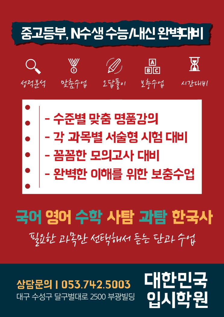 대한민국입시학원은 공부량보다 공부 방식과 학습 흐름을 먼저 점검하는 학원입니다. 성적이 오르지 않는 이유는 복잡하지 않습니다. 방법이 맞지 않거나, 점검이 이루어지지 않기 때문입니다. 저희는 그 지점부터 시작합니다. 대한민국입시학원은 학생의 현재 위치를 정확히 보고 목표까지의 과정을 설계합니다. 1. 수업은 ‘진단’에서 출발합니다 ✔바로 진도를 나가지 않습니다. • 현재 성적 분석 • 취약 단원 확인 • 문제 풀이 습관 점검 • 시험 대비 방식 점검 어디를 고쳐야 점수가 오르는지 먼저 정리한 뒤 수업을 설계합니다. 2. 수업은 ‘관찰’을 기반으로 진행됩니다 ✔진도만 나가는 수업은 하지 않습니다. • 반복되는 계산 실....... <img src="https://blogthumb.pstatic.net/MjAyNjAyMjdfMjYy/MDAxNzcyMTcwNjAzODE4.wtPQmEODdD_Esg2LsvOT-5KuIDjYsUmtKhe7z6gPgdQg.pE-wCu1C4EXTjWrYt_YUTfBEKR3JD8RYwCbWGNIU-64g.JPEG/623.jpg?type=s3" />