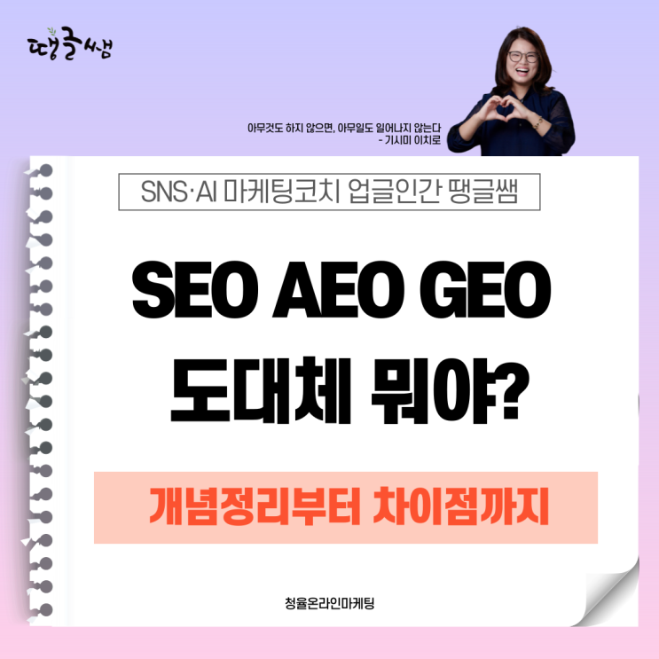 안녕하세요. SNS·AI 마케팅을 어려워하는 분들에게 자세하고 쉬운 마케팅코칭을 통해 비즈니스의 성과를 도와드리는 SNS·AI마케팅코치 땡글쌤입니다. ^^ SEO·AEO·GEO, 요즘 왜 이렇게 말이 많을까요? 땡글쌤이 정리해드릴께요.^^ ✍️ 요즘 마케팅 글 보면 처음 보는 약자들이 계속 나오죠. SEO는 알겠는데 AEO? GEO? 솔직히 말해서 “아… 또 뭘 공부하라는 거야” 이 생각부터 드는 게 정상이에요 그런데요, 이 용어들 외운다고 매출이 오르진 않습니다.^^;; 다만, 이 개념을 모르고 글을 쓰면 노출이 점점 줄어드는 건 사실이에요. 왜냐면, 검색을 ‘사람’이 아니라 ‘AI’가 대신 읽는 시대가 되었거든요. 검색 환경이 어떻게 바뀌었냐....... <img src="https://blogthumb.pstatic.net/MjAyNjAzMTlfMTI1/MDAxNzczODcwOTk5ODI0.5hYKEcEzqHrDQhNdMd0WkFoZ5R17UEaWQSXUr7je2c4g.5Gib0HwRUpuak-PTITX71M1i03FGWSXxvSx8MOD00Dsg.PNG/%C0%CE%BD%BA%C5%B8%B1%D7%B7%A5-001.png?type=s3" />