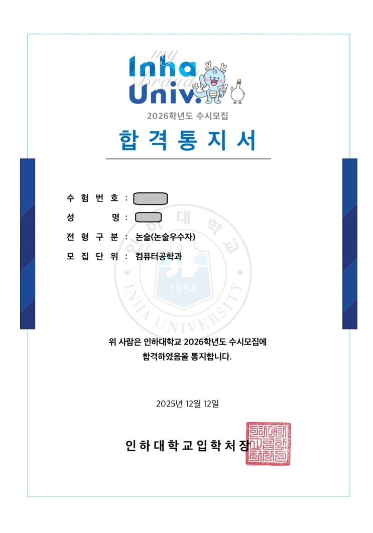 인하대 수리논술 합격 - 인천 논현동 수확책 수학학원