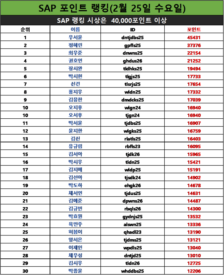 안녕하세요, 더클래스어학원입니다. 2025년 02월 25일 기준 SAP 포인트 랭킹 순위표입니다. <img src="https://blogthumb.pstatic.net/MjAyNjAyMjVfMTk1/MDAxNzcxOTk5MjIxNTcy.eWFyVAZjkydNbGPzN_mljKHiFtvseBD0UvlHcUHmTqgg.GmVHYCfOe1XShv98f0CWRsLH3elKLVBXTsw1HJgcfFQg.PNG/image.png?type=s3" />