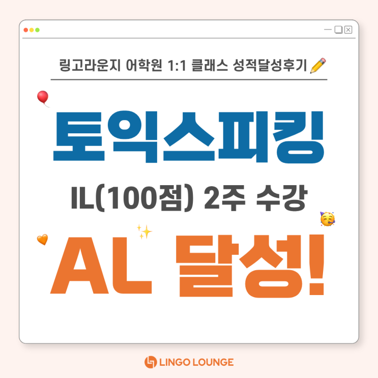 안녕하세요! 성인 일대일 외국어 회화 전문 링고라운지 어학원입니다. 오늘은 단 2주만에 토익스피킹 IL(100점)에서 AL(160점)을 달성한 기적과도 같은 레벨 달성 후기를 보여드리려고 합니다. 최근 취업 기준이 점점 높아지면서 IH보다는 AL을 희망하는 수강생분들이 더 많이지고 있는데요. 후기의 주인공인 수강생분 역시 3월 공채 시즌을 대비해 미리 어학 성적을 취득하고자 등록해주신 케이스입니다 :) 우리 수강생 분은 Be동사도 잘 모르고 단어양은 한 없이 부족하고 문장은 어떻게 끊어야 하는지, 해석해야 하는지 어려워하시는데다 발음 자체는 너무 좋지만 억양이 굉장히 어색한 문제들이 있었는데요...! 'IM3만이라도 딸 수 있었....... <img src="https://blogthumb.pstatic.net/MjAyNjAzMDVfNDUg/MDAxNzcyNjkwODQwMDQ3.TsO0MjSy8K2BRJCMa8ng-FtdJ_h_UeHnk7FfF6EDAOEg.SvSONPZ8riDpg_8yVCcjXtVMiTNRk4fXxtfcSVuNZBgg.PNG/1.png?type=s3" />
