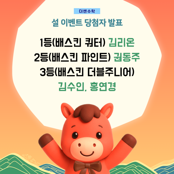 안녕하세요. 더쎈수학 삼현학원입니다. 설 연휴 동안 정성 가득 만들어온 우리 친구들의 말 키링 알록달록 색감도, 털 표현도, 장식까지 하나하나 개성이 가득했어요 학원에서 진행한 투표 결과 많은 표를 받은 작품들이 선정되었습니다 하지만 사실… 순위를 매기기 어려울 만큼 모두 정말 정성스럽고 멋진 작품이었답니다 참여해준 우리 친구들 모두 칭찬해요 연휴 기간 즐겁게 참여해줘서 고마워요! 당첨자에게는 기프티콘 발송해드렸습니다. 앞으로도 즐거운 이벤트로 아이들의 성취감과 참여도를 함께 키워가겠습니다 궁금하신 부분 또는 상담 예약은 전화 031-852-3493 또는 아래 링크를 통해 가....... <img src="https://blogthumb.pstatic.net/MjAyNjAyMjNfMTkg/MDAxNzcxODE3NzMyMTMx.TJcfSbZ3p9m4HTzbHrHFDxhBdECzFTJyVrLzUU8MFlsg.Y3yFRJH6Mwe0rrmHJ5rMwxmhB_AMZC5FAysoMqxFe5cg.PNG/image.png?type=s3" />