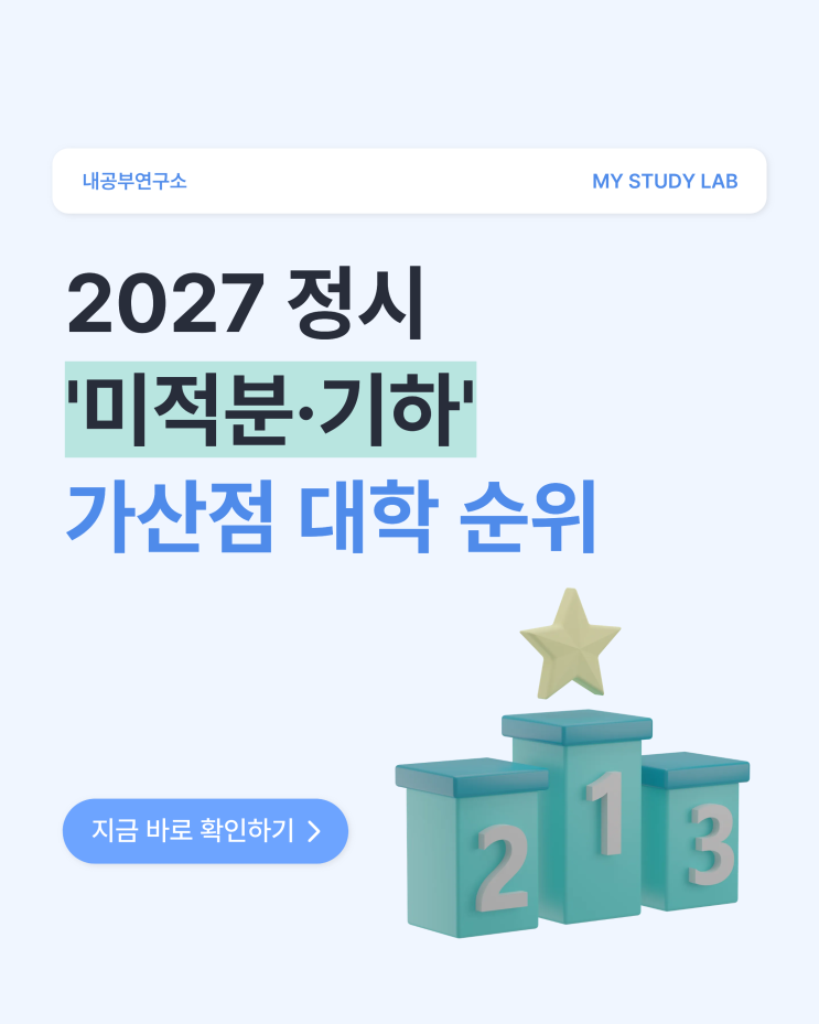 안녕하세요. 내공부연구소입니다. 2027학년도 대입 정시 모집에서 수학 선택과목(미적분/기하)에 가산점을 부여하는 대학 현황을 정리했습니다. 통합형 수능 체제에서 자연계열 수학 변별력을 확보하기 위해 주요 대학들이 미적분과 기하 응시자에게 가산점을 부여하고 있습니다. 확률과 통계 선택자가 교차 지원을 고려하거나, 자연계열 수험생이 대학을 선택할 때 반드시 고려해야 할 요소입니다. 구간별 해당 대학은 다음과 같습니다. 구간별 가산점 반영 대학 ✅️ 10%~ 15% 가산 : 제주대(최대 15%), 강원대(10%), 건국대 글로컬(10%), 상명대(10%), 청주대(10%, 미적분 한정) ✅️ 7% 가산 : 숭실대(자연 1계열) ✅️ 5% 가산 : 국민대, 동....... <img src="https://blogthumb.pstatic.net/MjAyNjAxMTlfMTI5/MDAxNzY4ODEzMzAzMzUw.5jfUK7sUo1BFxJabcmuVt_36t2JMlqiqmniW_VPpSisg.BjwsPUpI5bsYWu6nVXU0UPzqx2F-_Pd7lNd76BwLV-0g.PNG/1.png?type=s3" />