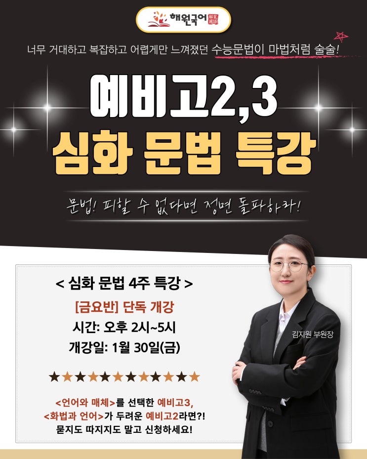 예비고2,3 4주 심화 문법 특강 예비고1 4주 문법특강 예비중3 4주 문법 특강 수강을 원하시면 학원으로 연락부탁드립니다. (후곡 본원 : 031-918-9995) 상담 가능 시간 : 평일 - 오후2시~10시 (화요일 휴무) / 주말 - 오전10시~오후10시 방문 상담 가능 (전화 예약 필수), 전화 문의 가능 (031-918-9995) <img src="https://blogthumb.pstatic.net/MjAyNjAxMjRfNTIg/MDAxNzY5MjQzNzg3NjM0.CWuHX9sK1MkHkYG8FJshT1yQtwIZVZCGOYtq6PQK0gQg.8bWUFSAP_4GGdc7GCaDyiMqxIQdIVcu5MVPJdBnGtpcg.JPEG/%BB%E7%BA%BB_-_%C1%A6%B8%F1%C0%BB-%C0%D4%B7%C2%C7%D8%C1%D6%BC%BC%BF%E4__%BA%B9%BB%E7%BA%BB-003.jpg?type=s3" />