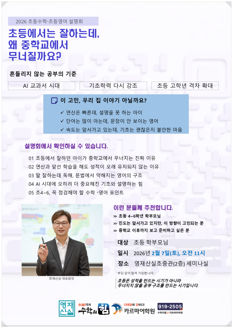 요즘 이런 얘기 많이 들으시죠. “초등 때는 잘하던 아이가 중학교 가면 갑자기 힘들어지더라…” 저도 상담하면서 이 말을 정말 자주 듣습니다. ✔ 연산은 빠른데 ✔ 영어 단어도 제법 아는데 ✔ 막상 문제를 설명하라면 말이 막히는 아이들 부모 입장에서는 “지금 잘하고 있는 건지, 아니면 속도만 앞서가고 있는 건지” 헷갈릴 수밖에 없는 것 같아요. 요즘은 또 AI 교과서, AI 학습 이야기도 많잖아요. “이제 공부도 예전이랑은 다르다던데…” “우리 아이 공부 방식은 괜찮은 걸까?” 이런 고민도 자연스럽게 따라오고요. 그래서 초등 수학·초등 영어를 ‘지금 시점에서’ 어떻게 봐야 하는지 한 번 차분히 정리하는 자리를 마련했습니다....... <img src="https://blogthumb.pstatic.net/MjAyNjAxMjZfMTE3/MDAxNzY5NDIwMjI1MTg0.FRSLnPwlERe6aRqLtXsOxEsKRi-NJnoFeclrnTtz26og.OsQgzzdN1o3aS_XL3xzUX1BUEIeizyUMZ-wZos22eBQg.PNG/%BD%BD%B6%F3%C0%CC%B5%E51.PNG?type=s3" />