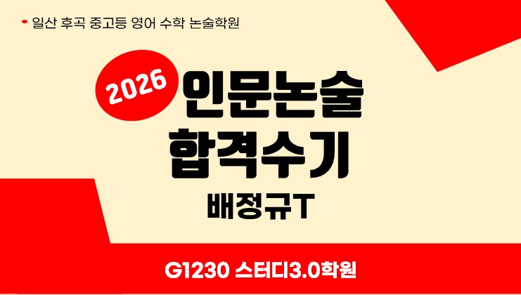 수강후기가 도움이 되셨나요? 아쉬운 수능등급을 극복하고 대학을 업그레이드하기에는 빠른 인문논술 시작이 답입니다. 인문논술은 준비가 빠르면 빠를수록 합격률이 높아집니다. 배정규 쌤과 함께 인문논술을 시작하고 싶은 학생은 후곡의 G1230 스터디3.0으로 Go, Go!!! 2026년 2월 7일 개강합니다. 토 2~6시 수강료: 4시간 4회 기준 360,000 예약문의 : 031 923 1877 031 918 1230 * 오시는 길 <img src="https://blogthumb.pstatic.net/MjAyNjAxMjdfNDQg/MDAxNzY5NDkzMDIxMTAy.EH3E_BqGYgPk68caEJZ4KyTAuac6Ljg9-8an8wOinvUg.7QQ2jNnCXWobgSbN_95UQP4cY_JiEc63HGhp7JhrFgAg.JPEG/%C0%CE%C8%C4.jpg?type=s3" />