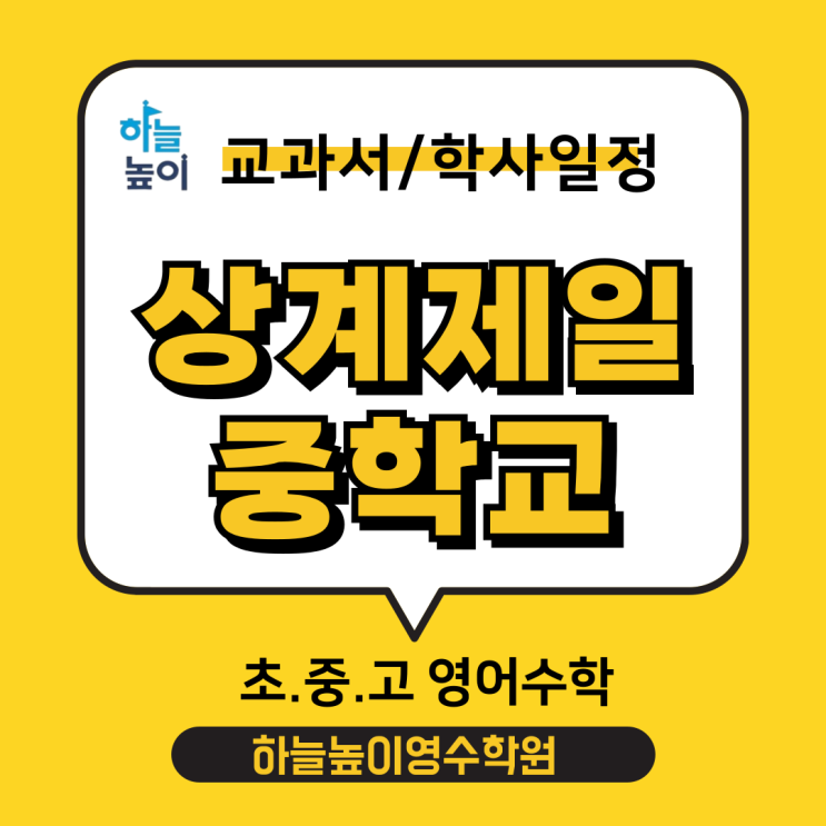 이제 곧 3월 신학기가 시작되네요. 상계제일중학교 학생들의 영어, 수학 그리고 전과목까지 성적을 책임지는 하늘높이영수학원에서 상계제일중학교 학사일정을 안내 드립니다 2026학년도 부터는 중등1학년과 2학년이 개편교과서가 적용됩니다 대표적으로 국어, 영어, 수학교과서는요 중등1,2학년 국어 - 천재(노미숙) 영어 - 동아(이병민) 수학 - 천재(김화경) 중등3학년 국어 - 천재(박영목) 영어 - 비상(김진완) 수학 - 동아(강옥기) 상계제일중학교 교과서안내 중1, 중2학년은 2022 개정교육과정이 적용되어 교과서가 개편되었어요 과목별로 기존 출판사와 상이한 부분이 있으니 표를 참고하여 자녀들의 학습과정에 도움이 되기를 바라는 마음....... <img src="https://blogthumb.pstatic.net/MjAyNjAyMjFfMjI0/MDAxNzcxNjUxODcwMzky.ubm6i8ouvjht3VdJW6XjHS0evVnHdSGrWYrM9Q6_wBUg.AGMfkMyNCOTRg0-ez4dqzkcbEop1k1jQrhfrl_gk7-8g.PNG/%C1%A6%B8%F1%C0%BB-%C0%D4%B7%C2%C7%D8%C1%D6%BC%BC%BF%E4_-001_%2819%29.png?type=s3" />
