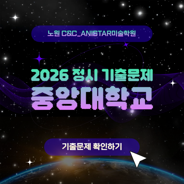안녕하세요~ 노원미술학원 미대입시전문학원 노원씨앤씨*애니스타 미술학원입니다 오늘은 2026년도 중앙대학교 미대 정시 기출문제를 알려드리러 왔습니다❤️ 이번에는 어떤 기출문제들이 나왔을까요? 중앙대학교 공예과 문제 : 제시된 사물의 조형적 특성을 활용하여 화면에 구성하고 표현하시오. 제시물 : 호루라기, 컬러차트, 만년필 중앙대학교 실내환경디자인 문제 : 제시된 사물의 조형적 특성을 활용하여 화면에 구성하고 표현하시오. 제시물 : 유리주전자, 행주, 컵 중앙대학교 패션디자인 문제 : 제시된 사물의 조형적 특성을 활용하여 화면에 구성하고 표현하시오. 제시물 : 헤어롤, 목마, 리본 중앙대학교 시각....... <img src="https://blogthumb.pstatic.net/MjAyNjAyMjNfNTcg/MDAxNzcxODQ4MDY4NTY4.RW9zf1WBIuwXv1Vj1y_pp-EQ98Q2-7HvlJQv9lIXWpIg.RWE_e_BsxtiE9MenVFO3SyfluJ7QZADGNW9rtEZpT6wg.PNG/004.png?type=s3" />
