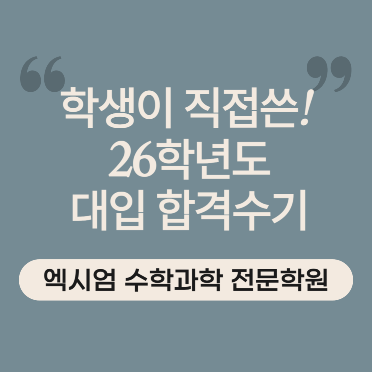 엑시엄 대입 합격생이 직접 작성한 합격수기입니다. 학생들의 치열했던 고교 생활과 그 곁을 지켜온 선생님들의 열정 가득한 지도가 자연스럽게 떠오릅니다. 2026학년도 대학 입학을 진심으로 축하드리며, 모든 졸업생 여러분이 즐겁고 행복한 대학 생활을 보내길 응원합니다. 이제 엑시엄은 학원의 모든 역량을 27학년도 후배들에게 집중하겠습니다. 각자의 목표를 향해 나아가는 학생들이 희망하는 대학에 합격할 수 있도록, 끝까지 책임지고 총력을 다해 지도하겠습니다. 항상 변함없는 신뢰와 응원을 보내주시는 학생 학부모님들께 진심으로 감사드립니다. 27학년도 12월 수시 최초 합격이라는 빛나고 압도적인 성과로 다시 찾아뵙겠습니다. ....... <img src="https://blogthumb.pstatic.net/MjAyNjAyMDhfMTI3/MDAxNzcwNTI2ODcwOTI1.nJs8_PyipX_l2MwiG5HiM580kJTT-aR4AM8DDFMnlBQg.VL3TSCwRCd5QhvMJBLWaH_ze4NNPfZ020-d0ZrOEUGsg.PNG/%C1%A6%B8%F1%C0%BB_%C0%D4%B7%C2%C7%D8%C1%D6%BC%BC%BF%E4_-001_%282%29.png?type=s3" />