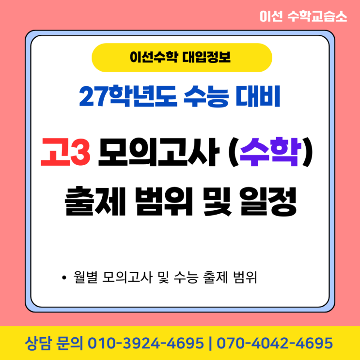 안녕하세요, 1학기 대비에 들어간 염창동 초등/ 중고등 1:1 수학전문 이선 수학교습소입니다. 개학하자마자 고등학생들에게 다가올 3월 모의고사를 위해 2026학년도 (27학년도 수능 대비) 모의고사 일정 및 출제 범위를 정리해보았습니다. 확정되지 않은 일정도 있으니 작성일 2026년 2월 23일 기준으로 하여 변동된 사항이 있는지 EBS 홈페이지에서 꼭 확인하시길 바랍니다. 항상 어떻게 하면 학생들에게 더 좋은 방향의 수업을 제공할 수 있을지 끊임없이 연구하고 고민해나가는 이선수학이 되도록 하겠습니다. 긴 글 읽어주셔서 감사합니다! 최선을 다하겠습니다. 믿고 맡겨주시는 모든 분들, 항상 감사드립니다. ☎️ 070-4042-4695 (전화) ?....... <img src="https://blogthumb.pstatic.net/MjAyNjAyMjNfMjY2/MDAxNzcxODEzMjIxODY0.jINa0sxc_4SWf-K51fuMoJrqsMvSFMcw1gGEdQS9pFgg.w3Ic6l1oXhfwucV8IwWsV11bkX9aB_2gX4ZdIrQpAfQg.PNG/30.png?type=s3" />