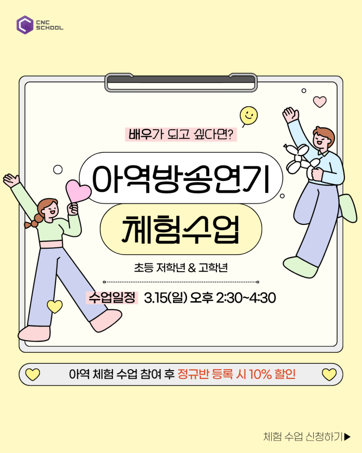 아역배우 되는 법? 우리 아이, 가능성 한 번 확인해보세요! “우리 아이는 끼가 많아요.” “사람들 앞에서도 긴장 안 하고 잘 말해요.” “드라마 속 아역배우 보면서 우리 아이도 할 수 있지 않을까 생각해봤어요.” 한 번쯤 이런 고민 해보셨죠? 영화, 드라마, 광고를 보다 보면 ‘우리 아이도 아역배우 한번 시켜볼까?’ 생각하는 부모님들이 정말 많습니다. 그래서 준비했습니다! 씨앤씨스쿨 아역 방송 연기 체험 수업 모집 방송연기가 처음이어도 괜찮습니다. 연기를 한 번도 배워본 적 없어도 OK! 아이의 가능성을 직접 확인해볼 수 있는 아역 방송 연기 체험 수업을 정기적으로 진행합니다. 체험 수업 안내 일정 : 2026년 3월 15일(일....... <img src="https://blogthumb.pstatic.net/MjAyNjAzMDRfMjIz/MDAxNzcyNjAyMTk4NzU1.isq7ycW9Nftj8NStaxj9VohMx35_61Tqr1N0luylQb8g.dGlV3j0t_qkRlFoKogAJ6UxkIwAQaF5VEWUM-c0b-u0g.PNG/1.png?type=s3" />