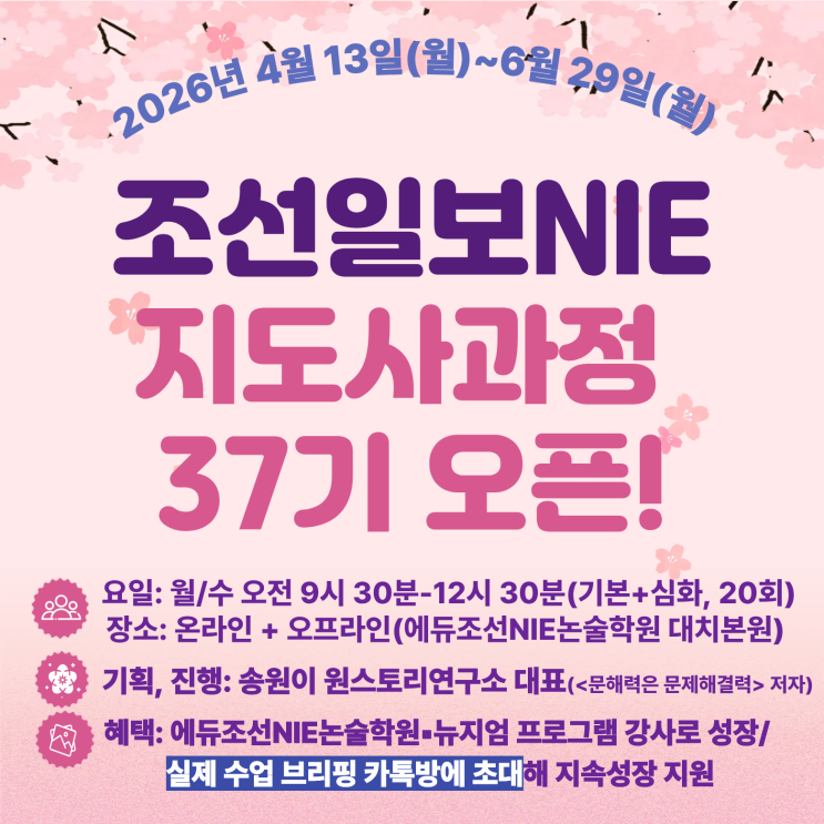 봄이네요. 4월 13일부터 시작할 조선일보NIE지도사과정 37기입니다. 올해 대한민국 기운은 다 몰아가던 주식시장이 어제에 이어 오늘 대폭락을 했죠. 허한 마음 가득한 분도 많겠지만, 이런 날의 교훈은 '내가 진정 무엇을 준비했는가'로 귀결되더라고요. 준비된 사람에겐 기회가 옵니다. 그 첫걸음은 제대로 준비할 장을 분별하는 것. 커리큘럼을 꼭 확인해주세요. '자격증에 걸맞은 진짜 공부'를 저랑 하시죠. 조선일보 NIE, 에듀조선 NIE 논술학원 <img src="https://blogthumb.pstatic.net/MjAyNjAzMDRfMjM3/MDAxNzcyNjE0MjI2ODMw.8CfR4q5ui3jCAO_xYLn3X2rXJQr0-dxsfGXmvyj24Xog.fiFZjfNm5NyptciAm9Hq8JIdrjWdWoq1dlN52SxjRv0g.PNG/37%B1%E2%C6%F7%BD%BA%C5%CD%BC%F6%C1%A4%C3%D6%C1%BE.png?type=s3" />