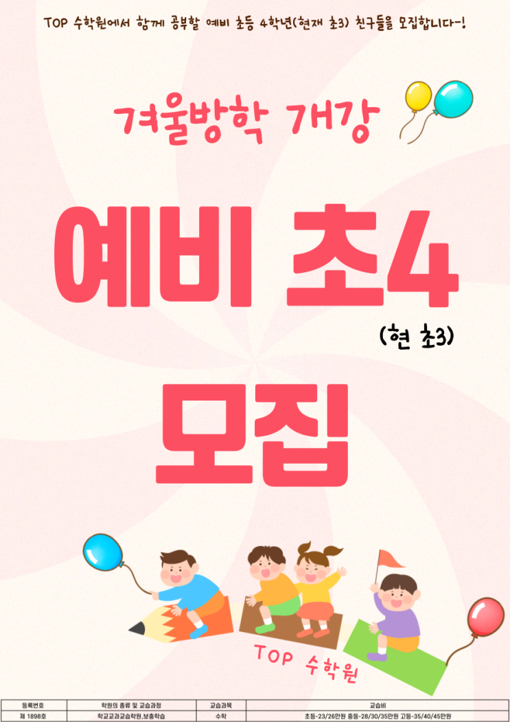 다가오는 2026년 1월 예비 초등4학년 반이 개강합니다! TOP 수학원에서 함께 공부할 예비초4(현 초3) 친구들을 모집합니다. 많은 관심 부탁드립니다♥️ 더 궁금하신 점이나 그 외 문의사항은 전화 주시면 자세히 안내해드리겠습니다:) 감사합니다. ☎ 051.362.5385 <img src="https://blogthumb.pstatic.net/MjAyNTEyMjJfOTIg/MDAxNzY2Mzg4NzA5NDQw.rMQ3oZ4kF44Pzu1DKl-ZSaB-TnPz18zhBdDVVrf_kgog.jr6e7xJ9d-nA0DLiYswwfrhYOiILvXSVdtLb64wApS8g.PNG/2025%B3%E2-2%C7%D0%B1%E2-%B0%B3%B0%AD-006.png?type=s3" />