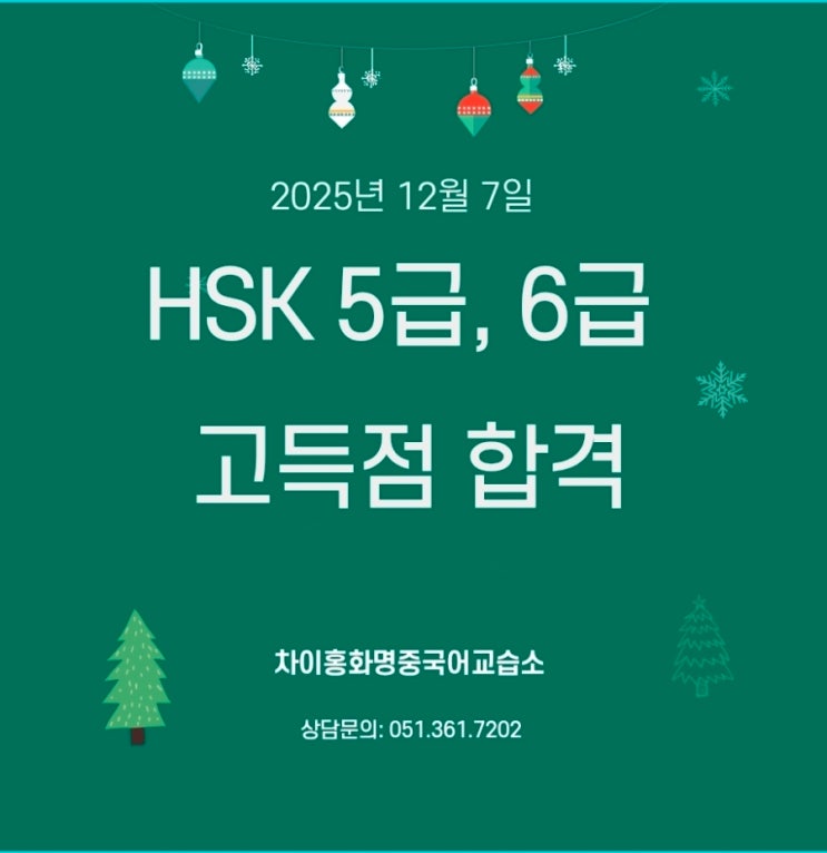 大家好 차이홍화명중국어교습소입니다. 2025년 12월 7일에 실행한 HSK IBT 시험 성적 발표되었습니다! #차이홍화명중국어교습소 HSK5급, 6급 고득점 현황입니다! HSK 5급: 245점 HSK 6급: 201점 HSK 6급 쓰기 - 핵심내용 요약하기 6급에서 가장 난이도가 높은 파트인데도 불구하고 쓰기에서 86점이라는 고득점을 받았습니다! 유학대비생, 승무원, 취준생, 주재원, 승진등 자격증 필요하시 분 문의주세요. 단기간에 HSK 취득할 수 있습니다! 차이홍화명중국어교습소 수업 문의 : 051.361.7202 010.7765.6630 <img src="https://blogthumb.pstatic.net/MjAyNTEyMjZfNTgg/MDAxNzY2NzIyNDgwNDQ5.bbBufUgnKj83bhg9aGofygaM9OmCWpfFCivlP9j4zPIg.uurHaO1-XVNVZK87O3G4hKwCf3jOaYR1bcB2CgZyGfsg.JPEG/900%A3%DFScreenshot%A3%DF20251226%A3%DF131331%A3%DFKakaoTalk.jpg?type=s3" />
