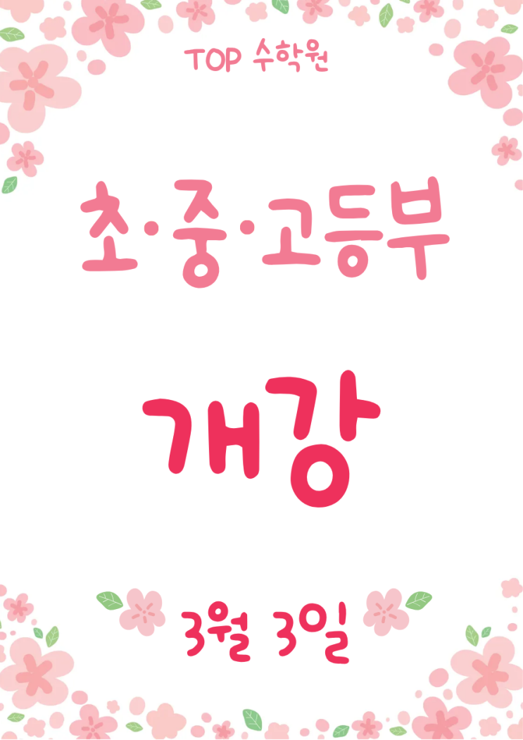 3월 3일 새 학기를 맞아 TOP수학원 전 학년이 개강합니다. 많은 관심 부탁드립니다. 더 궁금하신 점이나 그 외 문의사항은 전화 주시면 자세히 안내해드리겠습니다:) 감사합니다. ☎ 051.362.5385 <img src="https://blogthumb.pstatic.net/MjAyNjAyMjRfMTQ4/MDAxNzcxOTI5MjYwMDEz.tceI5GZ4gcx392Dw-4KDgTJHtFNuj_6wJUeIE_IWeDYg.N28xbU2tBTc90eMKZZWKzhfqE8XyVXF4NwgkUk_GBaIg.PNG/%BA%ED%B7%CE%B1%D7_3%BF%F9_%B0%B3%B0%AD.png?type=s3" />