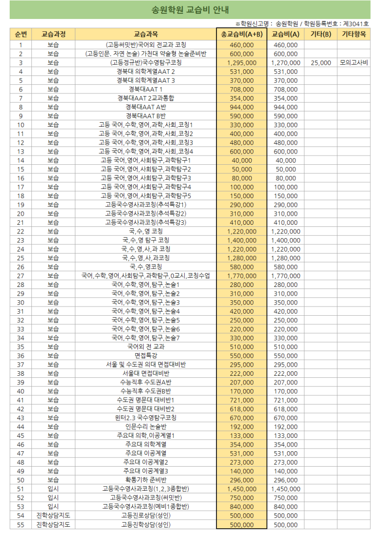 대구 송원학원 교습비 안내