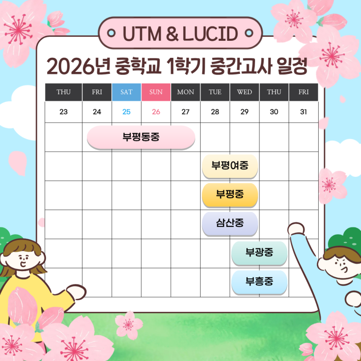안녕하세요. UTM&LUCID입니다. 추위가 한풀 꺽이고 봄날이 조금씩 다가오고 있습니다. 우리 친구들도 새로운 환경에 적응하느라 정신 없었을텐데요. 날씨가 따듯해지는 만큼 1학기 중간고사도 다가오고 있습니다! UTM&LUCID에서 우리 학생들과 학부모님께, 이번 중간고사에서 좋은 성적을 거두기 위해 꼭 챙겨야 할 실전 지침 3가지와 시험일정을 안내해 드립니다. 학교별 중간고사 일정 부평동중: 24일(금) ~ 27일(월) 부평여중: 28일(화) ~ 29일(수) 성주중: 27일(월) ~ 28일(화) 동수중: 27일(월) ~ 28일(화) 부평중: 28일(화) ~ 29일(수) 삼산중: 28일(화) ~ 29일(수) 부광중: 29일(수) ~ 30일(목) 부흥중: 29일(수) ~ 30일(목....... <img src="https://blogthumb.pstatic.net/MjAyNjAzMjBfMjM2/MDAxNzczOTk4OTAxMDcy.cm818z_niKFVDj2M96ZnUQACjBdJ_MOPJjg3rceUsVQg.hrniHxF4iyuMS92dfgvTv4l0J50SMDdukFXiqolj518g.PNG/%3F%A0%9C%EB%AA%A9%EC%9D%84_%3F%9E%85%3F%A0%A5%3F%95%B4%EC%A3%BC%EC%84%B8%3F%9A%94._%283%29.png?type=s3" />