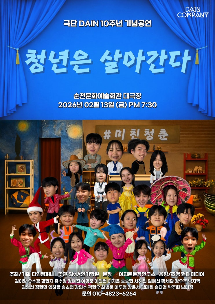 공연 〈청년은 살아간다〉 준비 현장 이야기 안녕하세요. 극단 다인 / SMA 연기학원 · SMA 뮤지컬 아카데미입니다. 오늘은 저희가 준비 중인 공연 〈청년은 살아간다〉 소식을 전해드리려고 합니다. 이 공연은 배우들이 직접 연습하고, 안무를 맞추고, 무대에 오르는 실제 공연입니다. 수업으로만 끝나는 연기가 아니라 ✔ 연습실에서 ✔ 무대 위로 ✔ 관객 앞까지 이어지는 경험 아이들에게는 잊지 못할 시간이 되고 있습니다. 공연 안무 영상 공개 이번에 공연 안무 일부를 유튜브 영상으로 먼저 공개하게 되었습니다. 위 영상은 공연 〈청년은 살아간다〉 안무 연습 영상입니다. 짧은 영상이지만 아이들이 얼마나 진지하게, 그리고....... <img src="https://blogthumb.pstatic.net/MjAyNjAyMDhfMjgw/MDAxNzcwNTUzMTAzMDUy.d3AV0mxPVxXsXcRc-2CL_9nfYUjdQQZb-q7WbnudkL8g.blsUbborE8Cv-lqBycewW5sMRJkRxQVQA4ANLP31E54g.JPEG/%C6%F7%BD%BA%C5%CD.jpg?type=s3" />