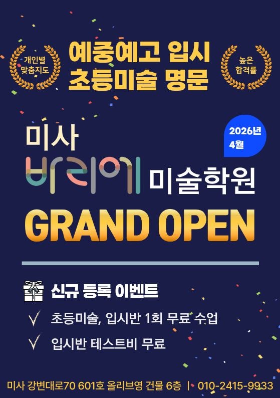 안녕하세요 미사 어린이 초등미술 예중예고 입시를 동시에 책입지는 미사 바리에 미술학원 입니다. 드디어 미사에 바리에 미술학원이 GRAND OPEN 하게 되었습니다 오랜 시간 준비하며 아이들에게 더 좋은 환경과 더 깊이 있는 교육을 제공하고자 노력해왔습니다. ✨ 예중·예고 입시, 초등미술 명문 바리에는 단순히 그림을 배우는 공간이 아니라 아이의 가능성을 끌어내고 실력과 태도를 함께 성장시키는 공간입니다. ✔ 개인별 맞춤 지도 ✔ 높은 합격률 ✔ 체계적인 입시 준비 초등 취미 미술부터 선화예중, 선화예고, 서울미고까지 이어지는 입시 시스템을 갖추고 있습니다. GRAND OPEN 신규 등록 이벤트 오픈을 기념하여 부담 없이....... <img src="https://blogthumb.pstatic.net/MjAyNjAzMjNfMTIz/MDAxNzc0MjMwNzk2Njk3.gB4Eb27I_8ZutXxWk9sojt9_RCDfrGLVNLEMMYH_0kQg.u8HNL5Za5bgmLiPJGCaah8RSkAUC92PeQgR7XrxtbbMg.JPEG/KakaoTalk_20260323_094135561.jpg?type=s3" />