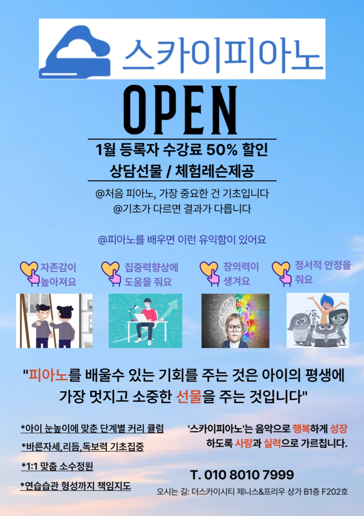 안녕하세요~~ 음악으로 성장하고 음악으로 행복하도록 사랑과 실력으로 가르치는 '스카이 피아노' 입니다. 처음 시작하는 피아노, 다시 시작하는 피아노, 등록을 위한 행정절차와 더 좋은 환경과 여건을 위한 인테리어 준비에 생각 보다 시간이 더 걸렸습니다~ 그만큼 더 준비된 환경과 좋은 수업으로 여러분을 찾아가겠습니다~ 개원 기념으로 '1월 등록자 수강료 50% 할인' 행사와 '소정의 선물'을 준비했어요. 쾌적하고 좋은 환경에서 원생들의 눈높이에 맞춘 체계적인 커리큘럼과 사랑 담긴 지도로, 음악이 즐거움이 되도록 돕겠습니다. 소중한 첫 피아노 수업, '스카이 피아노'에 믿고 맡겨 주세요....... <img src="https://blogthumb.pstatic.net/MjAyNjAxMDlfMTQ2/MDAxNzY3OTQ5NDg5MTE4.xzK0Szr_tduOOnD9c6saFKSwvBScFfB5sRhwMdEnJacg.75A6wTEj2O6KrtoDF9tU2vADXqtlHDwHtiwSkd86W14g.PNG/1%C2%F7_%C0%FC%B4%DC%C1%F6.png?type=s3" />