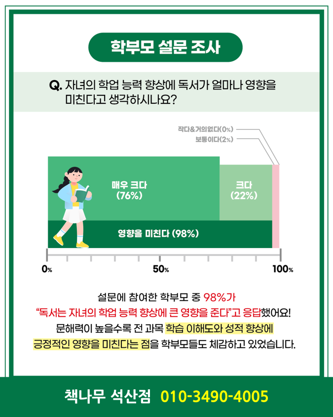 안녕하세요~ 책나무에서 실시한 학부모님 대상 설문조사 결과 분석입니다. 최근 책나무 본사에서 진행한 학부모 설문조사 결과를 보면서 저는 다시 한번 저의 독서 교육의 방향이 틀리지 않았다는 확신을 갖게 되었습니다. 단순히 "책을 읽는다"가 아니라, 읽고 이해하고 표현하는 과정까지 함께 지도했을 때 아이에게 어떤 변화가 일어나는지 학부모님들의 답변이 분명하게 보여주고 있답니다. 독서 기반 교육이 가장 중요한 출발점인 이유 이 응답이 매우 중요합니다. 독서가 전과목 학습의 도구라고 인식하는 학부모님이 98%라는 뜻입니다. 문제를 많이 푸는 아이보다 문제를 정확히 이해하는 아이가 결국 멀리 갑니다. 책나무는 20....... <img src="https://blogthumb.pstatic.net/MjAyNjAyMTVfMTQx/MDAxNzcxMTM1OTU0NTE0.MNqzlIpnmCEUcEv0ZzH7HhsFWNK8F5fHTjA_MmExFlQg.I3KrYERLJItGs4dtWjyRtjXwtfHv5IH9Oyo-TeTHGDog.PNG/image.png?type=s3" />