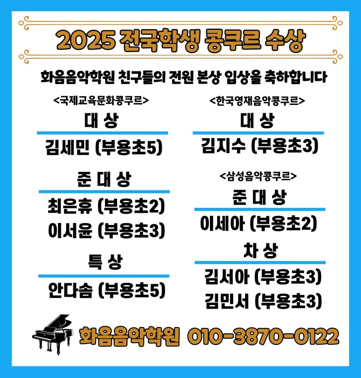 2025년 화음음악학원 아이들의 수상 결과입니다 열심히 또 열심히 노력한 우리 아이들의 결과라서 더욱더 벅차고 뿌듯합니다 2026년에도 최선을 다해 지도해서 좋은 결과를 받을 수 있도록 달려갑니다 우리 화음이들 너무 수고했어 우리 아이들에게 음악의 첫 걸음을 함께 하고 싶으신 분들은 010-3870-0122 로 연락주세요 의정부 부용초등학교 음악학원 부용초등학교 피아노학원 <img src="https://blogthumb.pstatic.net/MjAyNjAyMjVfMjQw/MDAxNzcyMDA4OTE0OTU1.YRxcstJGaX5Ss0JyR7yOR-7kDFJUvwKovCjkwXrYDQAg.lV3MT8tTx1_Uu0UsHpIbeknl78flpi0ga402ehIjEGog.JPEG/%C3%A2%B9%AE-001.jpg?type=s3" />