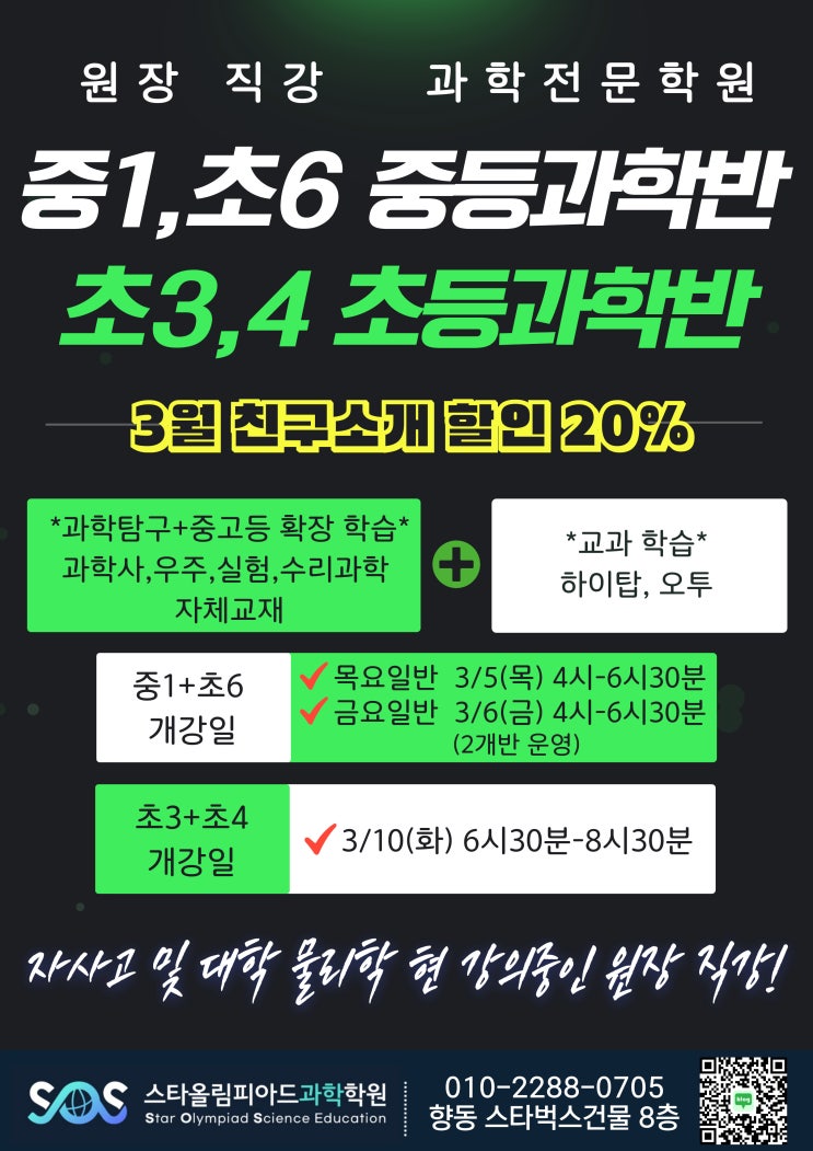 향동과학학원 안녕하세요 스타올림피아드과학학원입니다. #1 수업스케치 본 원은 과학 용어중 암기할 것은 수업 시간에 바로 외우게 하며 백지테스트를 통하여 그날 배운 것을 그날 소화해서 가게끔 하는데요. 과학용어만 생각하면 머리가 아픈 학생이 있다면 바비 맥퍼린의 'Don't worry, be happy'란 노래를 들려주기 전에 SOS 원장쌤을 만나보게 하는건 어떨까요? 과학용어만 생각하면 머리가 아프다고요? 돈 워리~ 비 해피~ SOS과학학원에 오면 과학은 그저 웃고 즐기며 자연스레 배우는 체득이 가능한 학문임을 경험하게 됩니다. SOS과학학원의 예비중3반의 경우 장기재원생 및 연속 100점 만점&고득점을 받는 아이들이....... <img src="https://blogthumb.pstatic.net/MjAyNjAyMjVfNzMg/MDAxNzcyMDEzMDk4MDg4.fN239s3nYSl8Vu1qiPQA3BcoJGf7HNluRM_aReDQytcg.M5mKW9qiNogDzPp0IjooCgsOU5rwLCSgZ6ltxhZpTTIg.JPEG/26%B3%E23%BF%F9%C3%CA6%C1%DF1_%C3%CA3_4%B1%A4%B0%ED-001_%283%29.jpg?type=s3" />